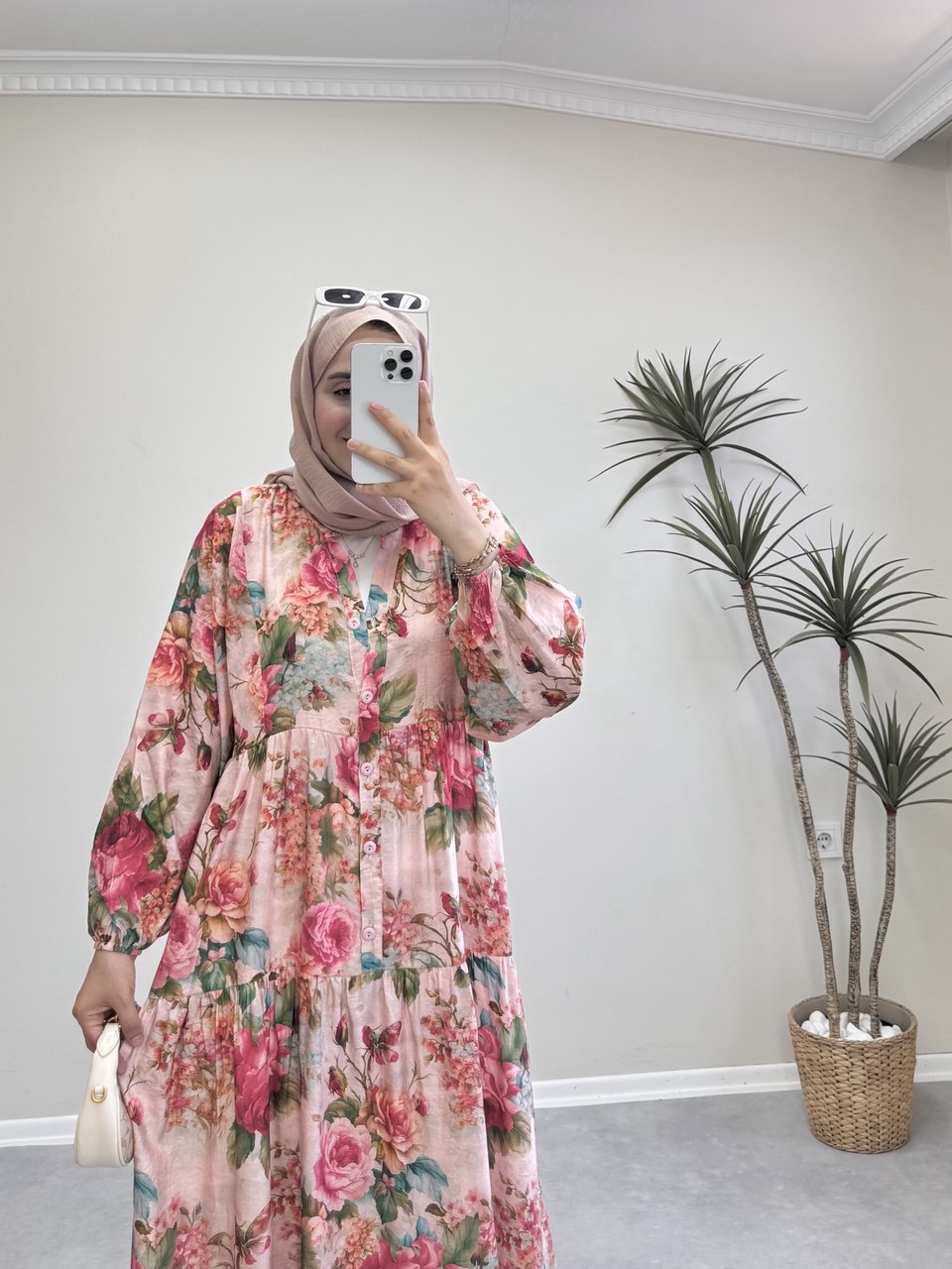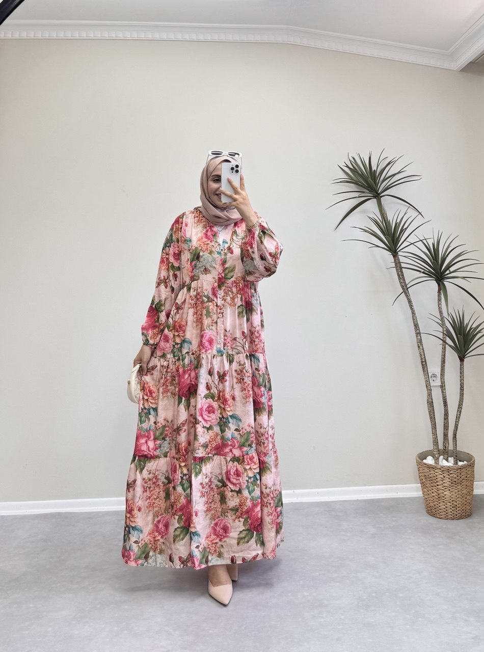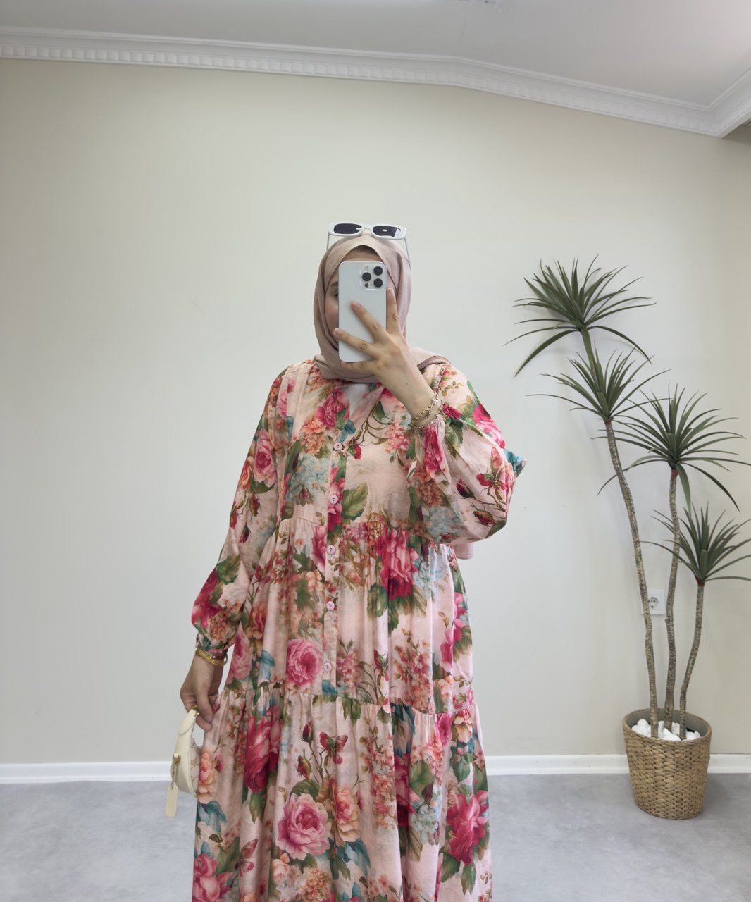 pamuk vual kumaştan üretilmiştir. Elbise boy 135-137 cm arası değişkenlik gösterebilir. Önü Düğme detaylıdır. 36-44 beden uyumludur.