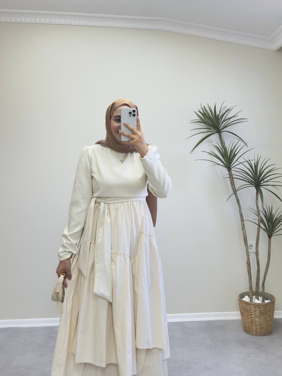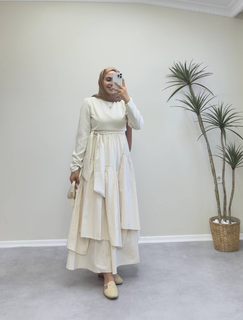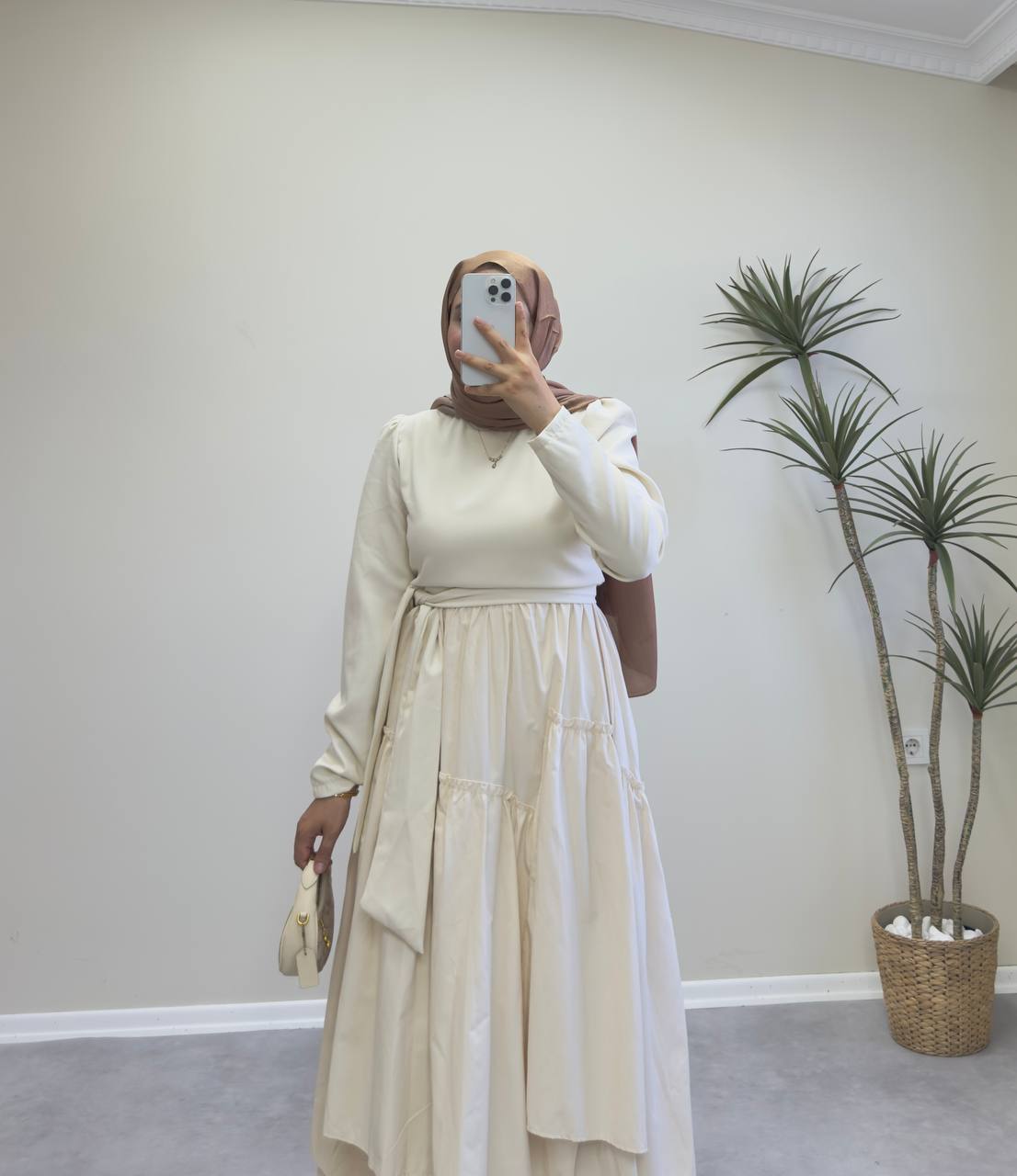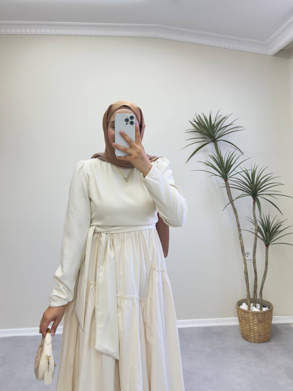 Elbise boy 140 cm dir. Sırt kısmı fermuarlıdır. Bir adet seyyar kuşağı mevcut. Tam kalıptır. Üst double krep kumaş alt poplin kumaştan üretilmiştir