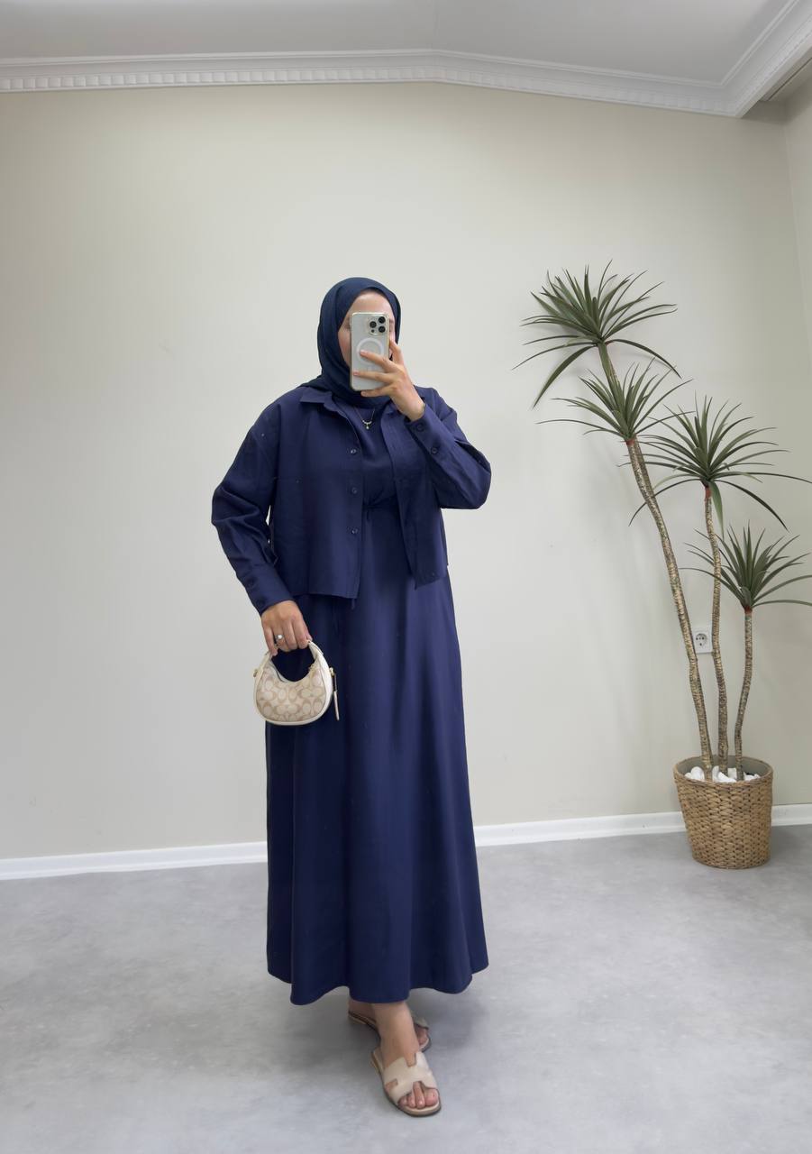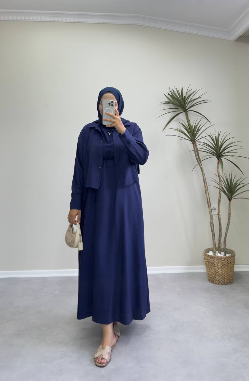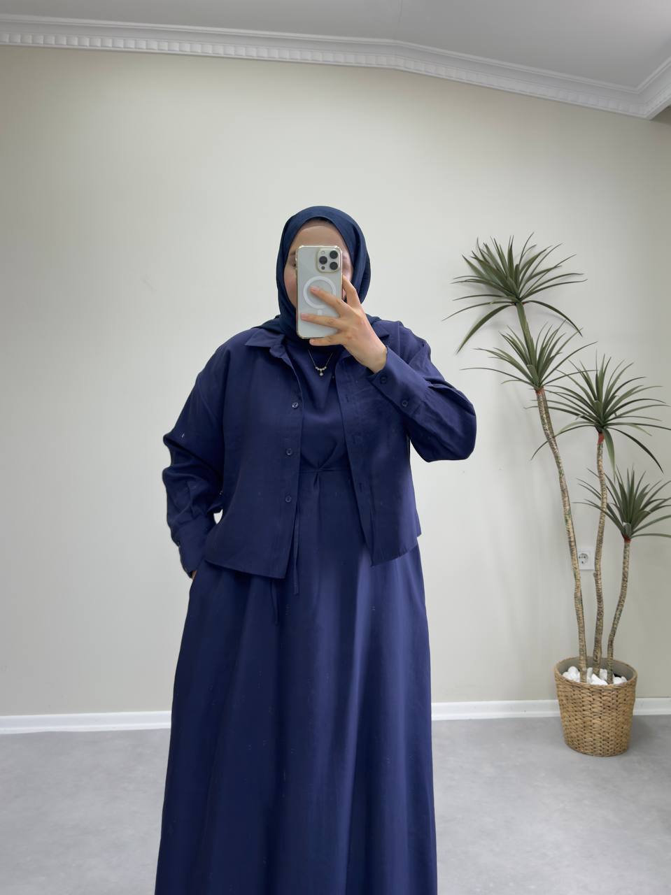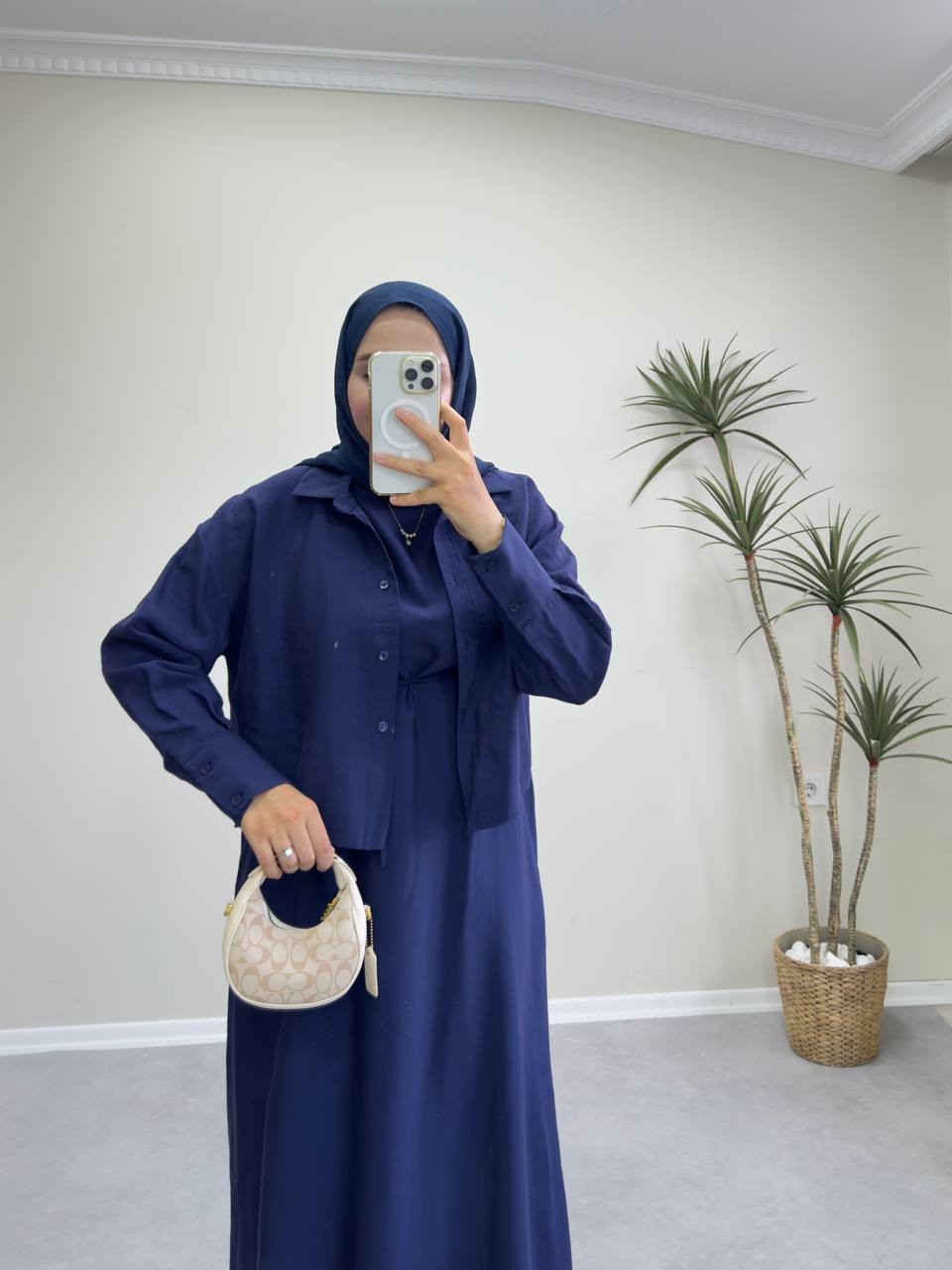 Tencel kumaştan üretilmiştir. İç elbise kolsuz jile şeklindedir. Yanlarında cep bulunmaktadır. Kendi kumaşından seyyar kemeri mevcut. Elbise boy 135 cm. Tam kalıptır.