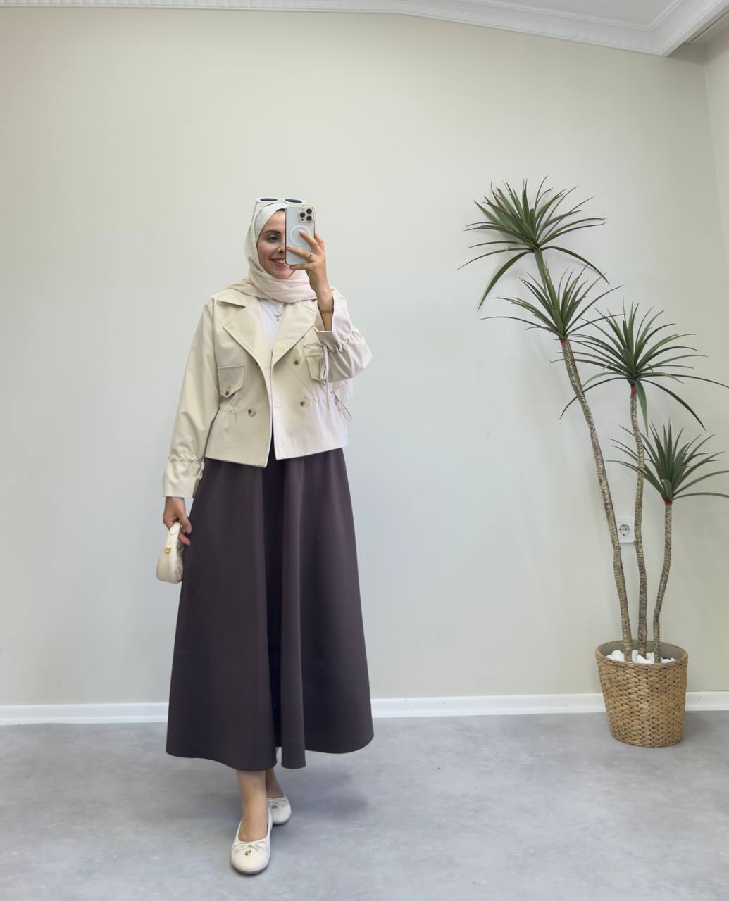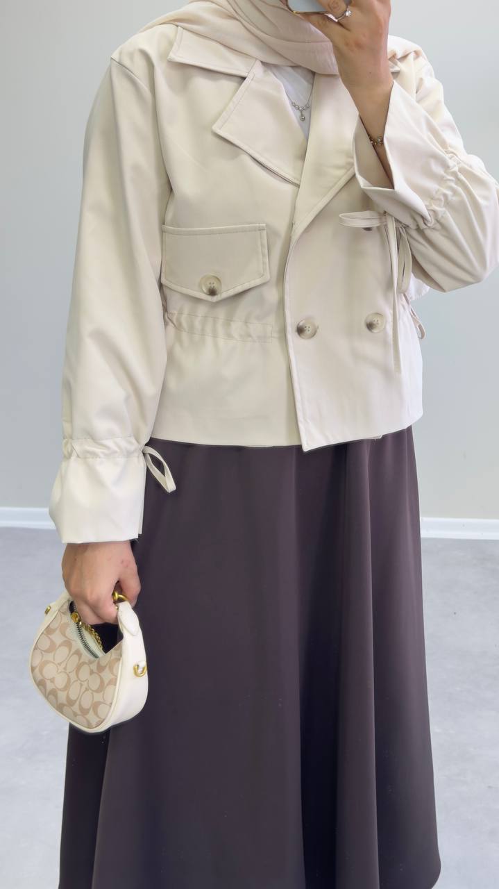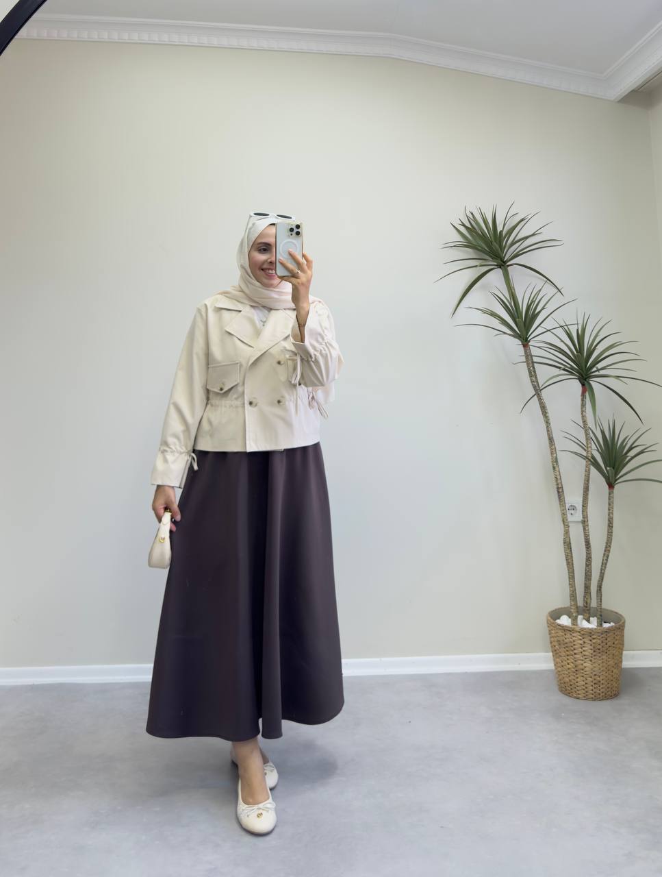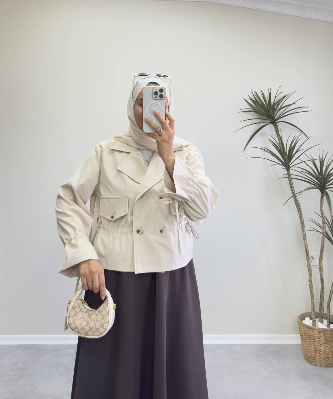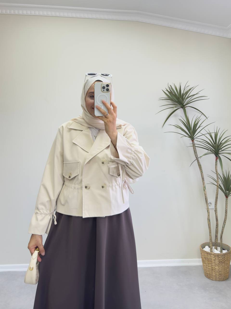 İnce gabardin kumaştır. Kol ve bel kısmını büzerekte kullanabilirsiniz. İç kısmı astarlıdır. Boy 55 cm dir. Tam kalıptır.