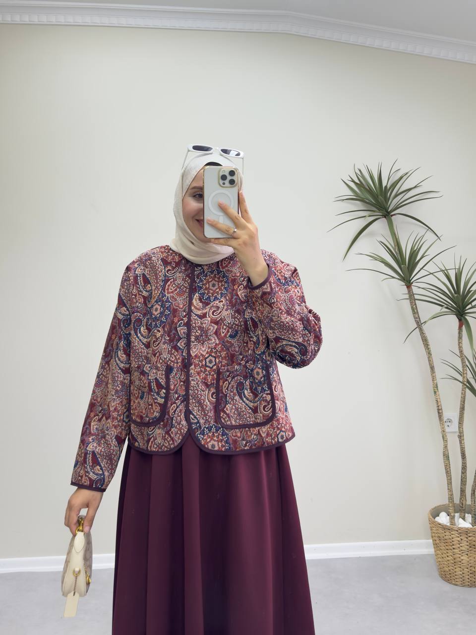 Jakar kumaştan üretilmiştir. Ceket boy 53 cm. Bir adet seyyar kemeri mevcut.