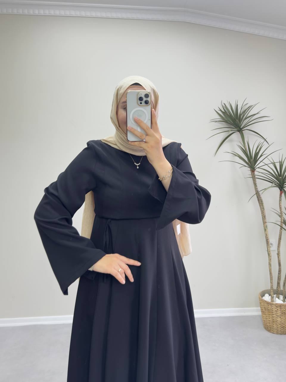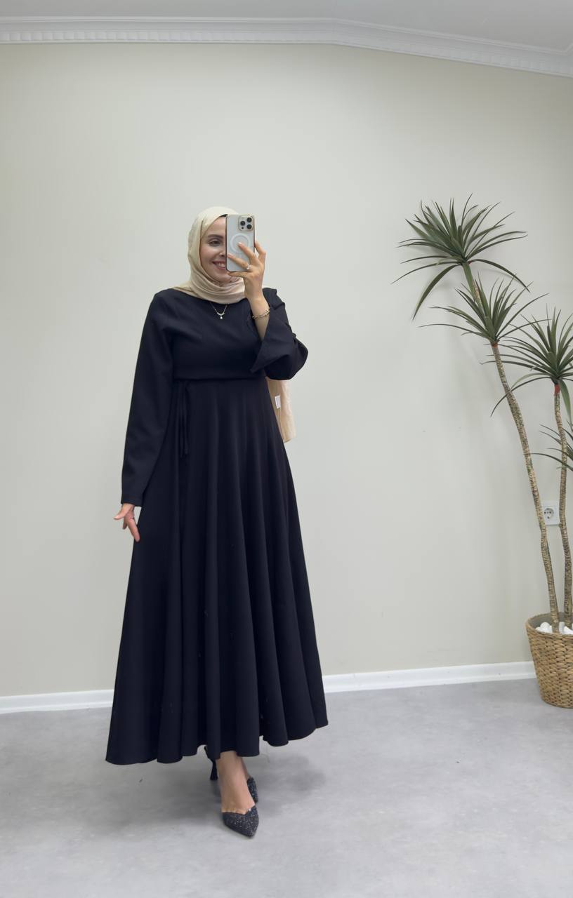 2516 - Belden Oturtmalı Kloş Elbise - Siyah
