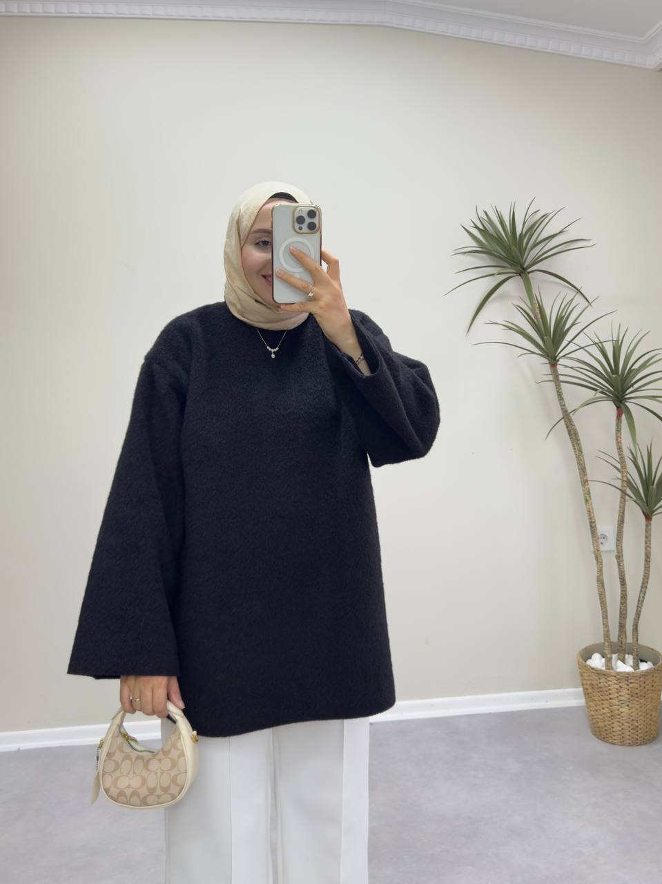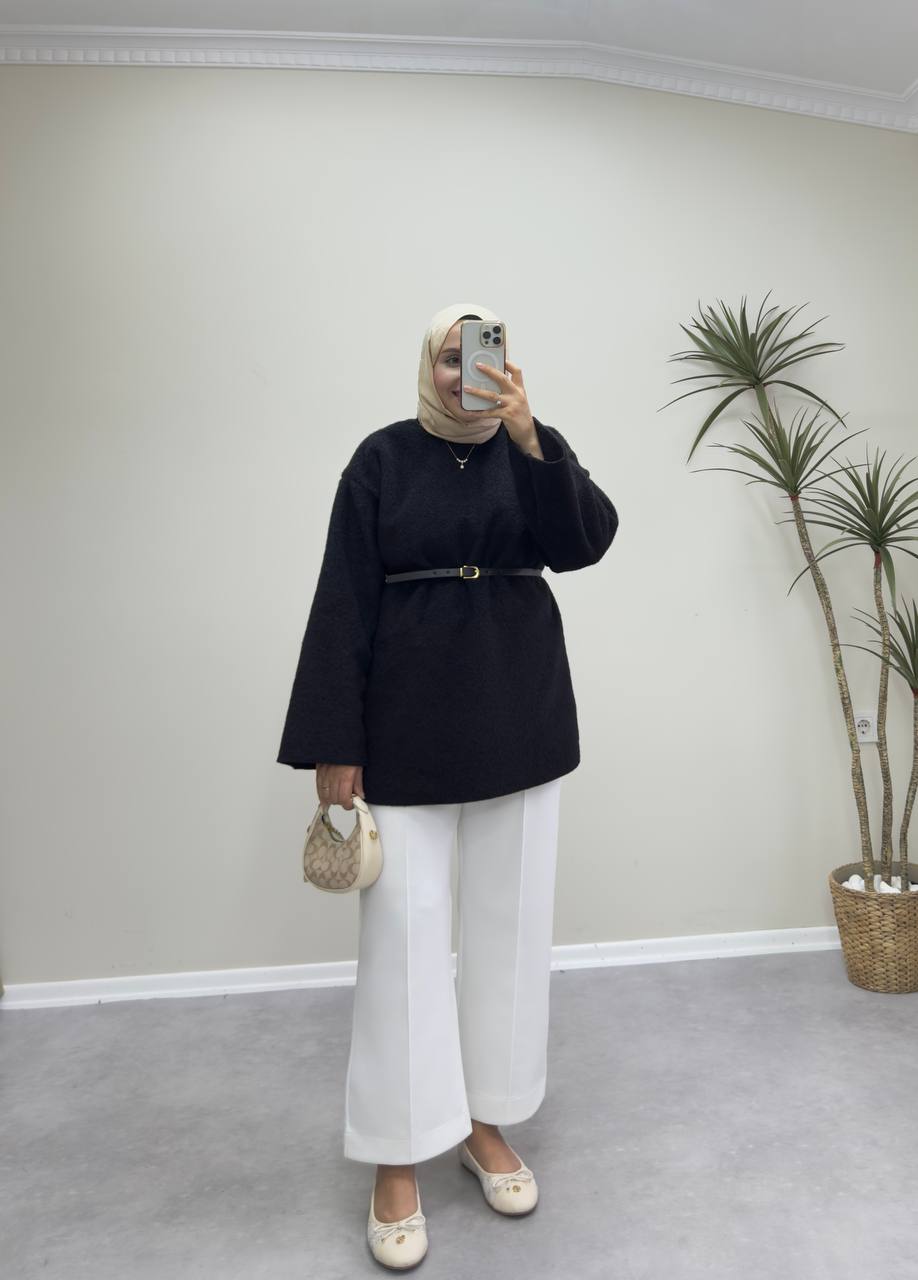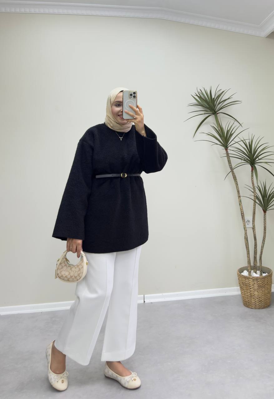 Dokulu yün kumaştır. Kazak boy 75 cm dir sırt kısmı fermuarlıdır, Bir adet seyyar kemeri mevcuttur.