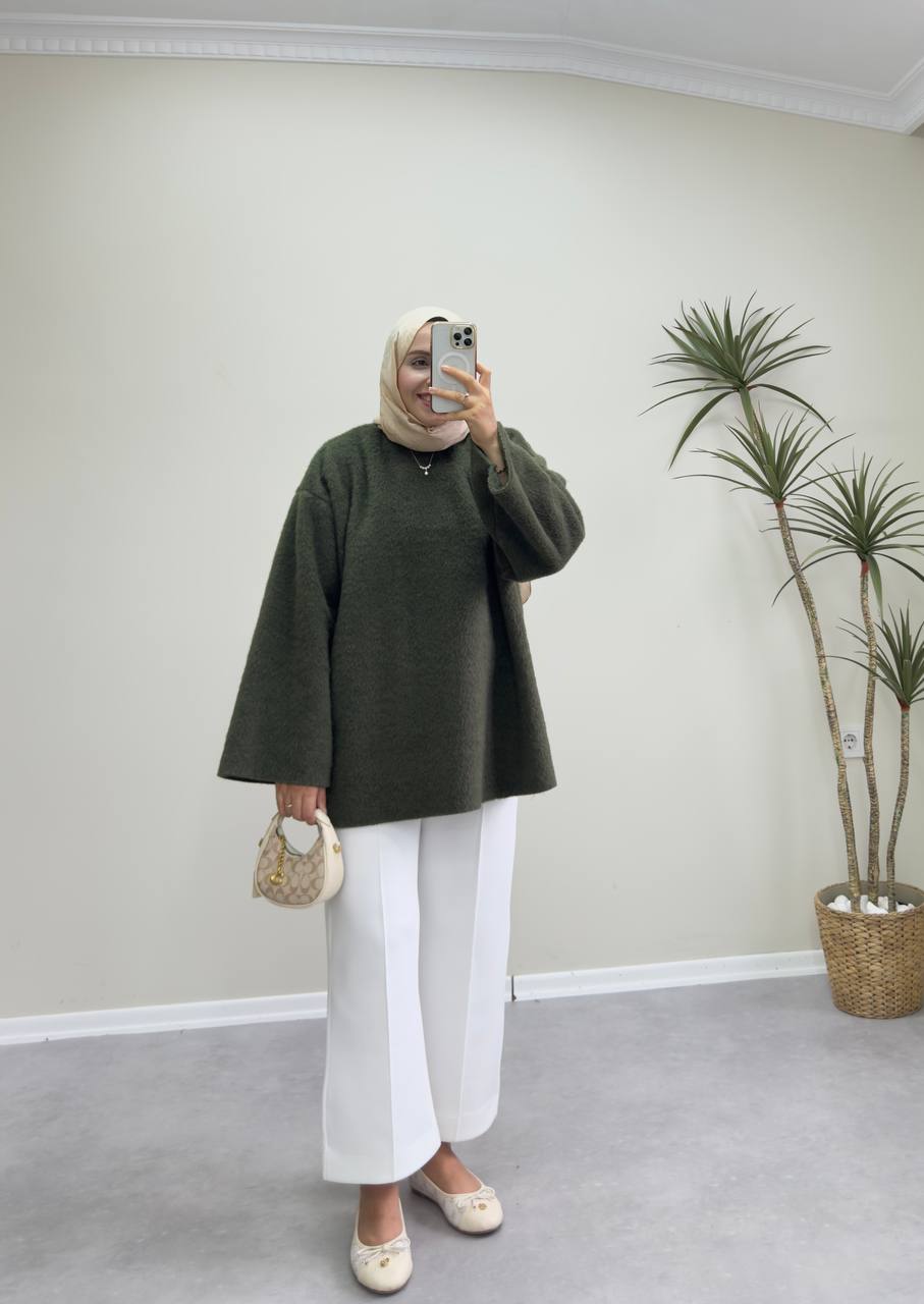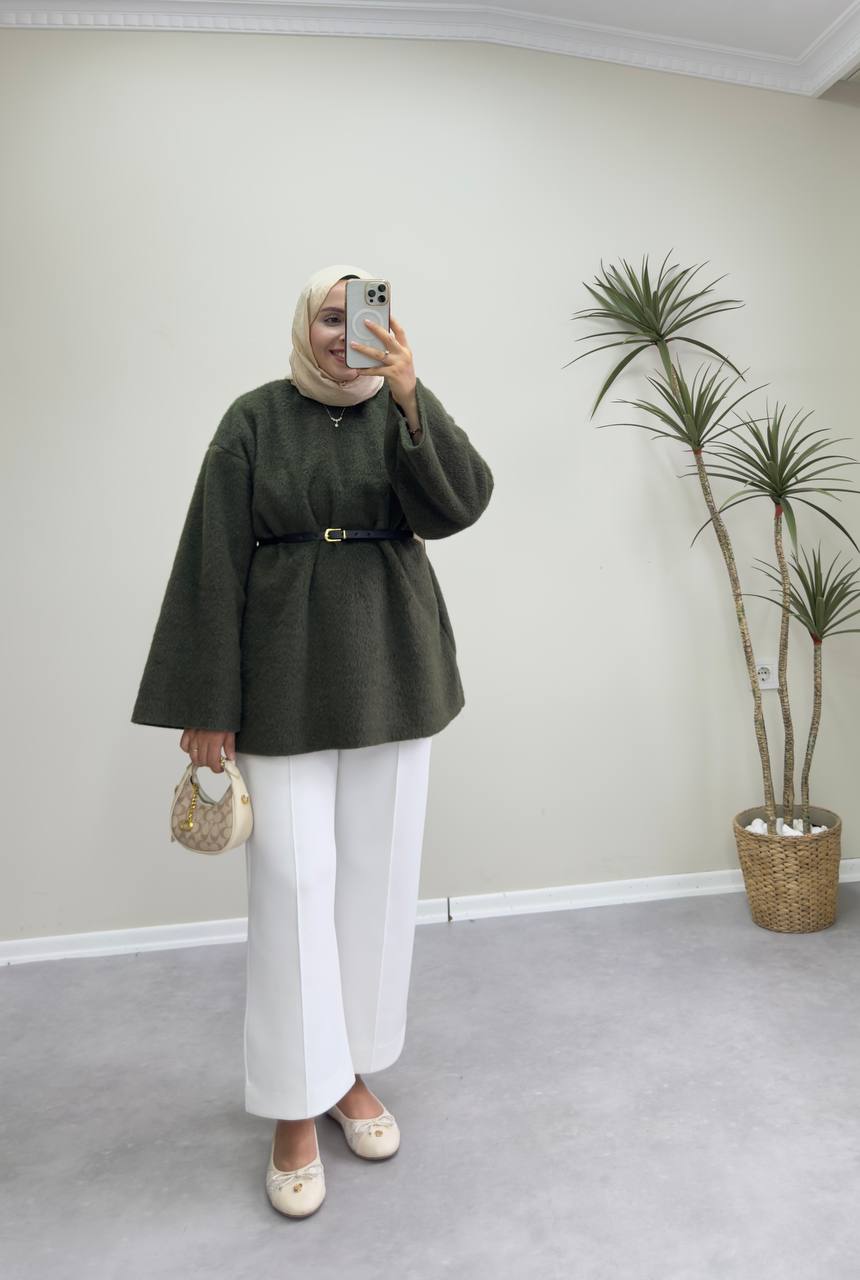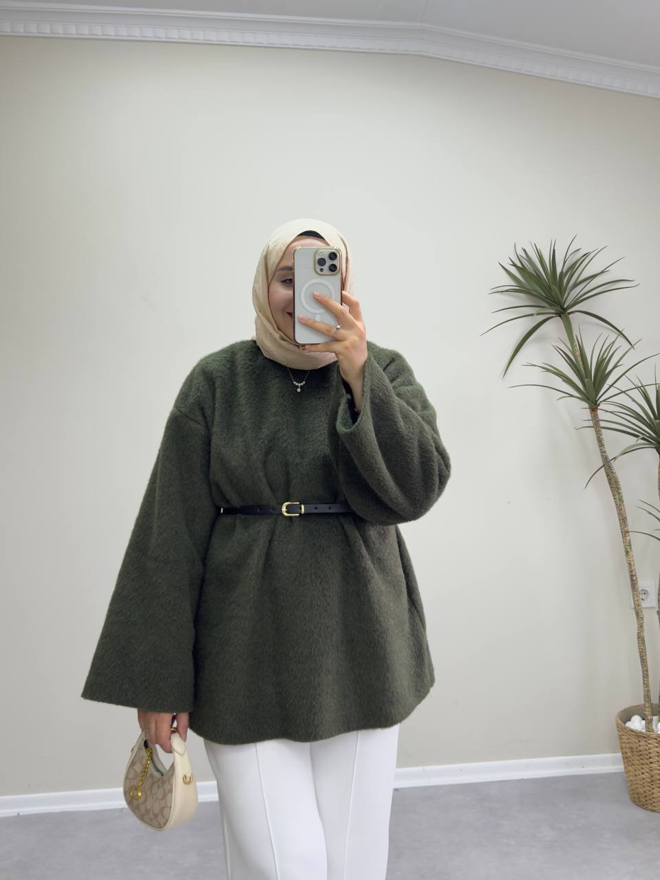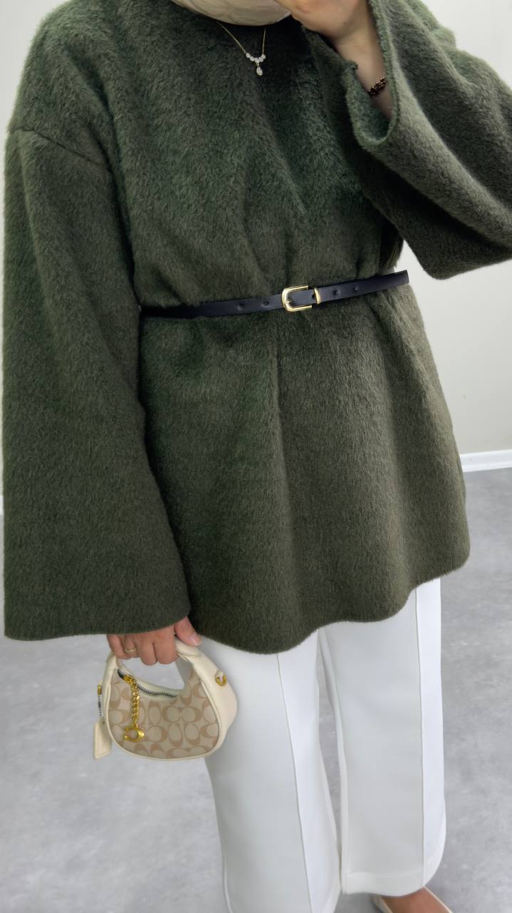 Dokulu yün kumaştır. Kazak boy 75 cm dir sırt kısmı fermuarlıdır, Bir adet seyyar kemeri mevcuttur.