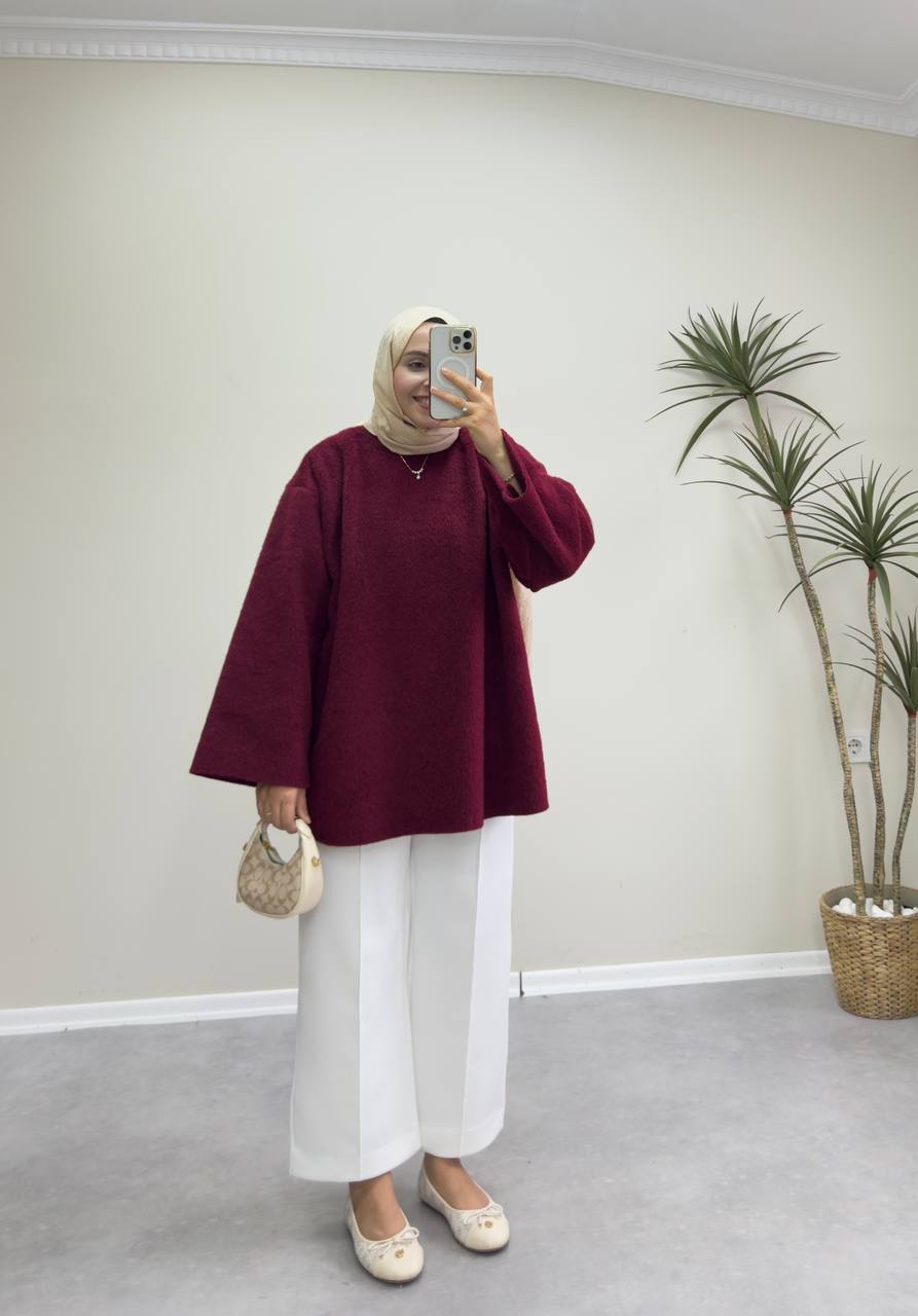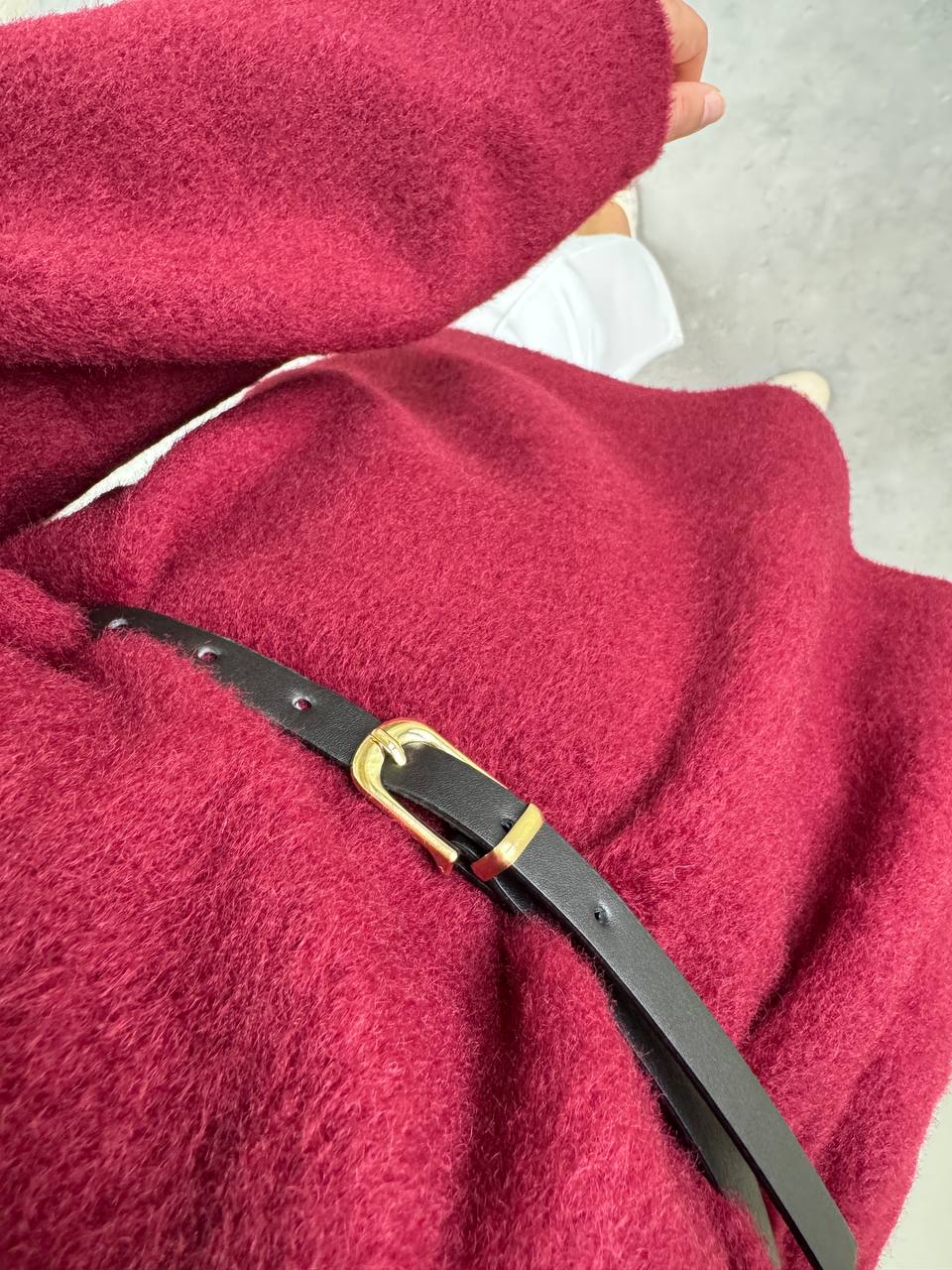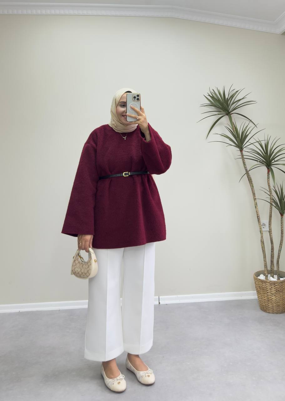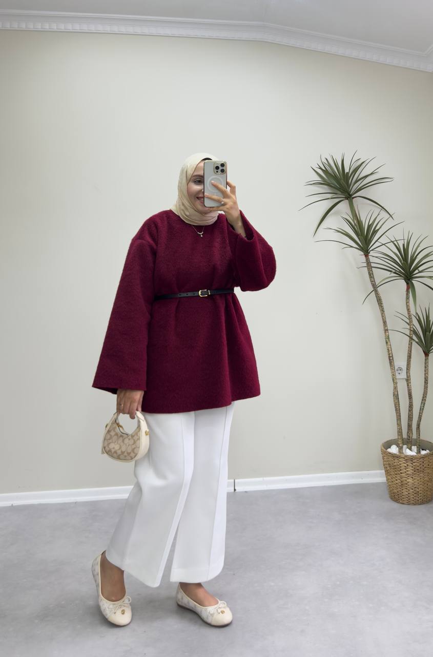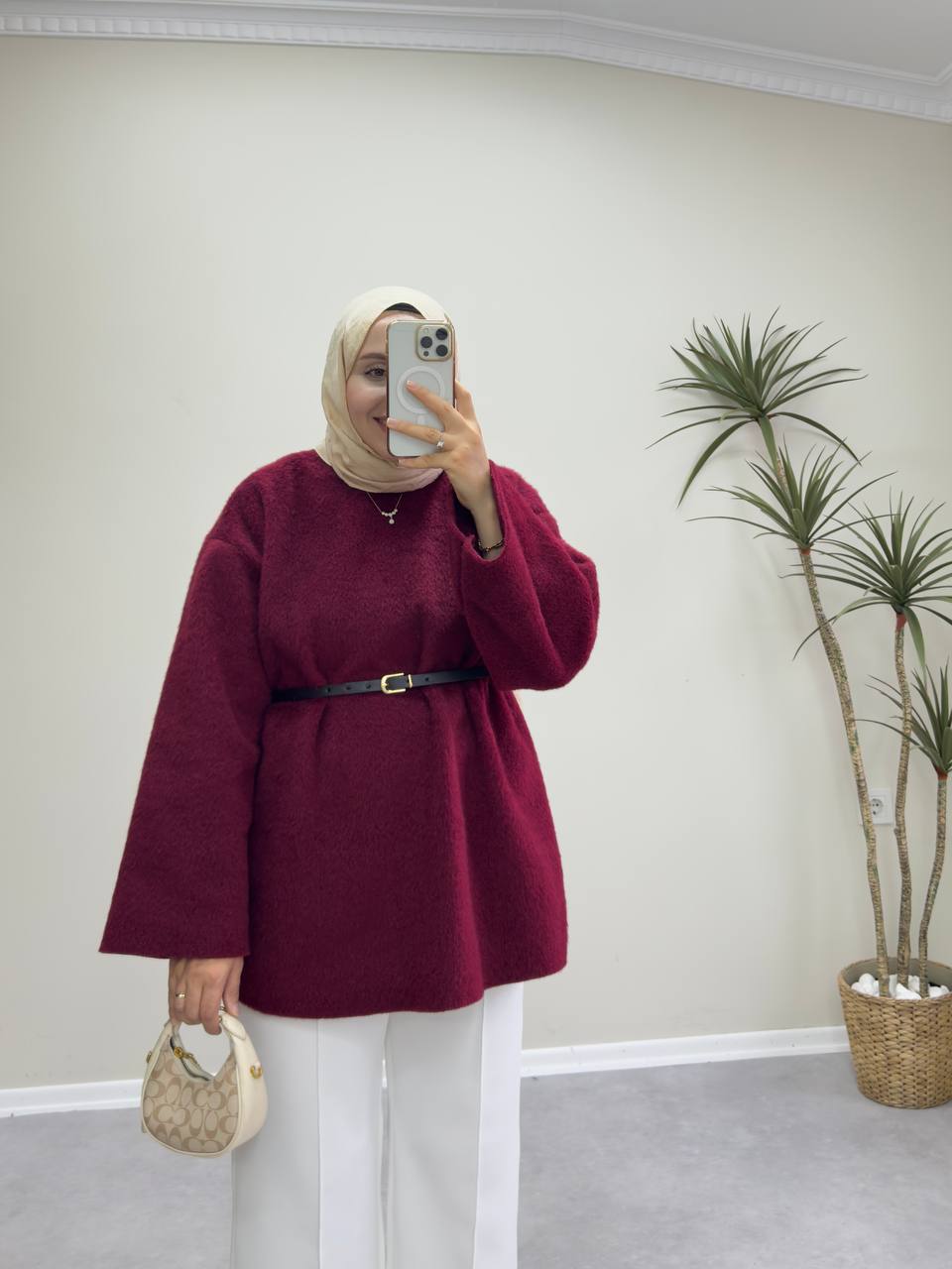 Dokulu yün kumaştır. Kazak boy 75 cm dir sırt kısmı fermuarlıdır, Bir adet seyyar kemeri mevcuttur.