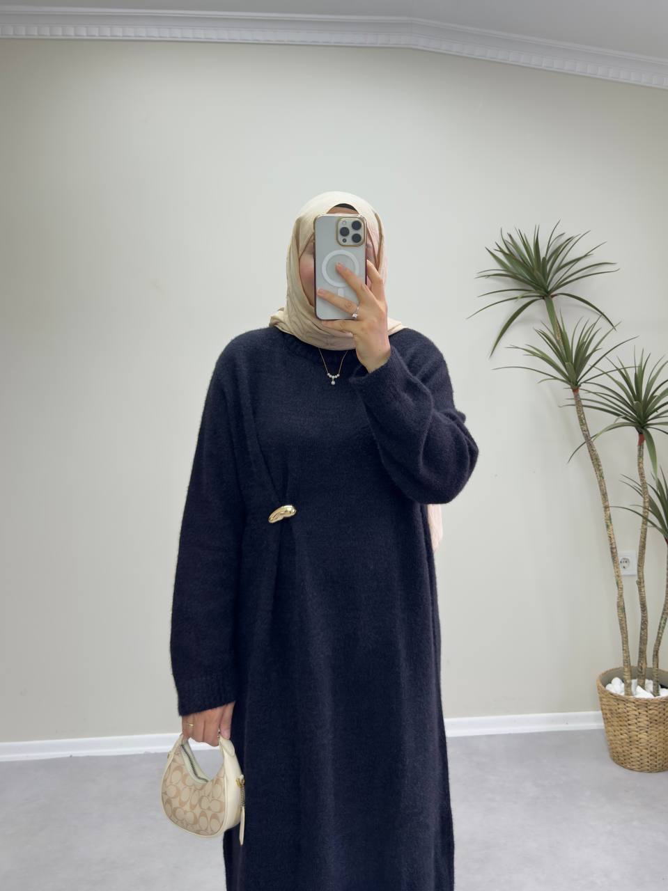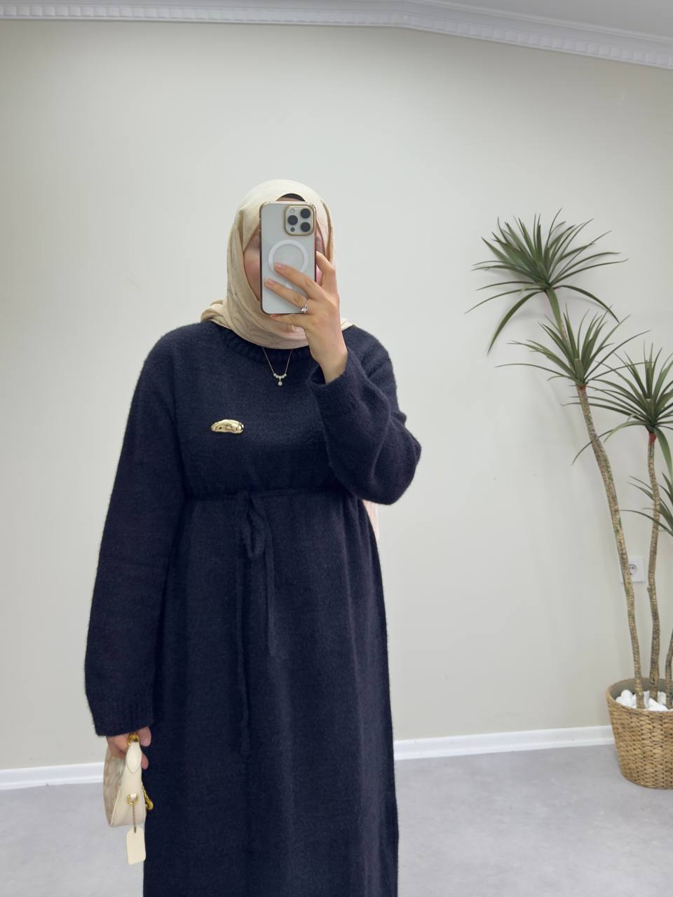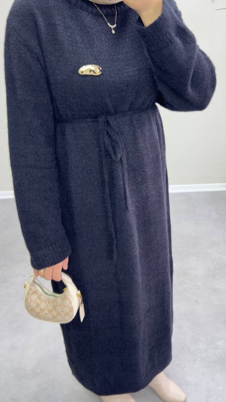 Elbise boy 133 cm sakallı triko kumaştır. Broş hediyelidir. Bir adet seyyar kemeri mevcut. Standart beden 36-44 beden uyumludur.