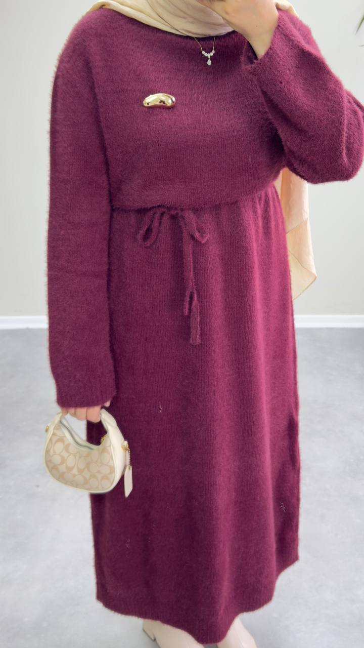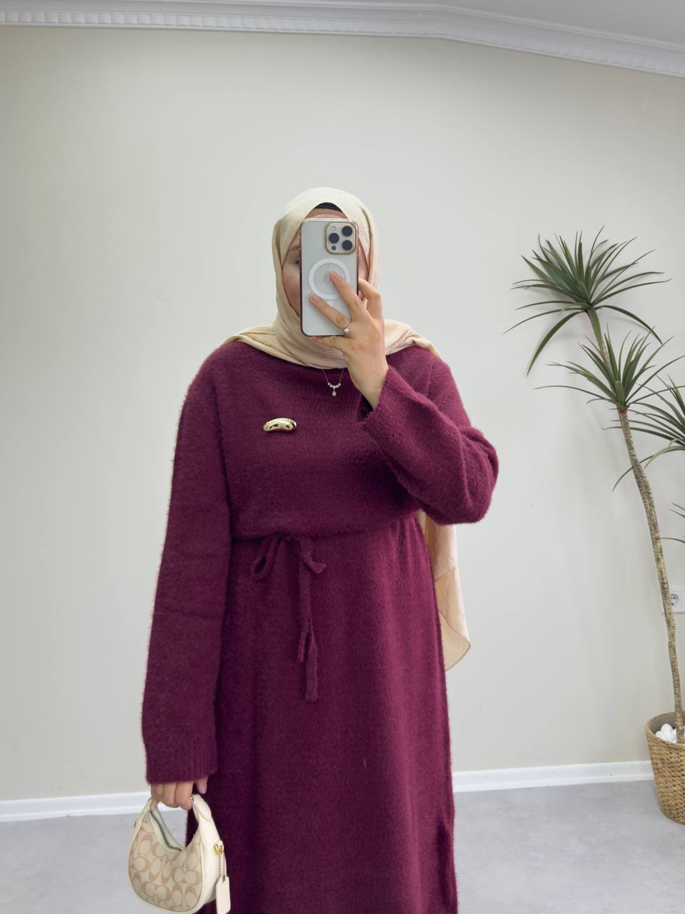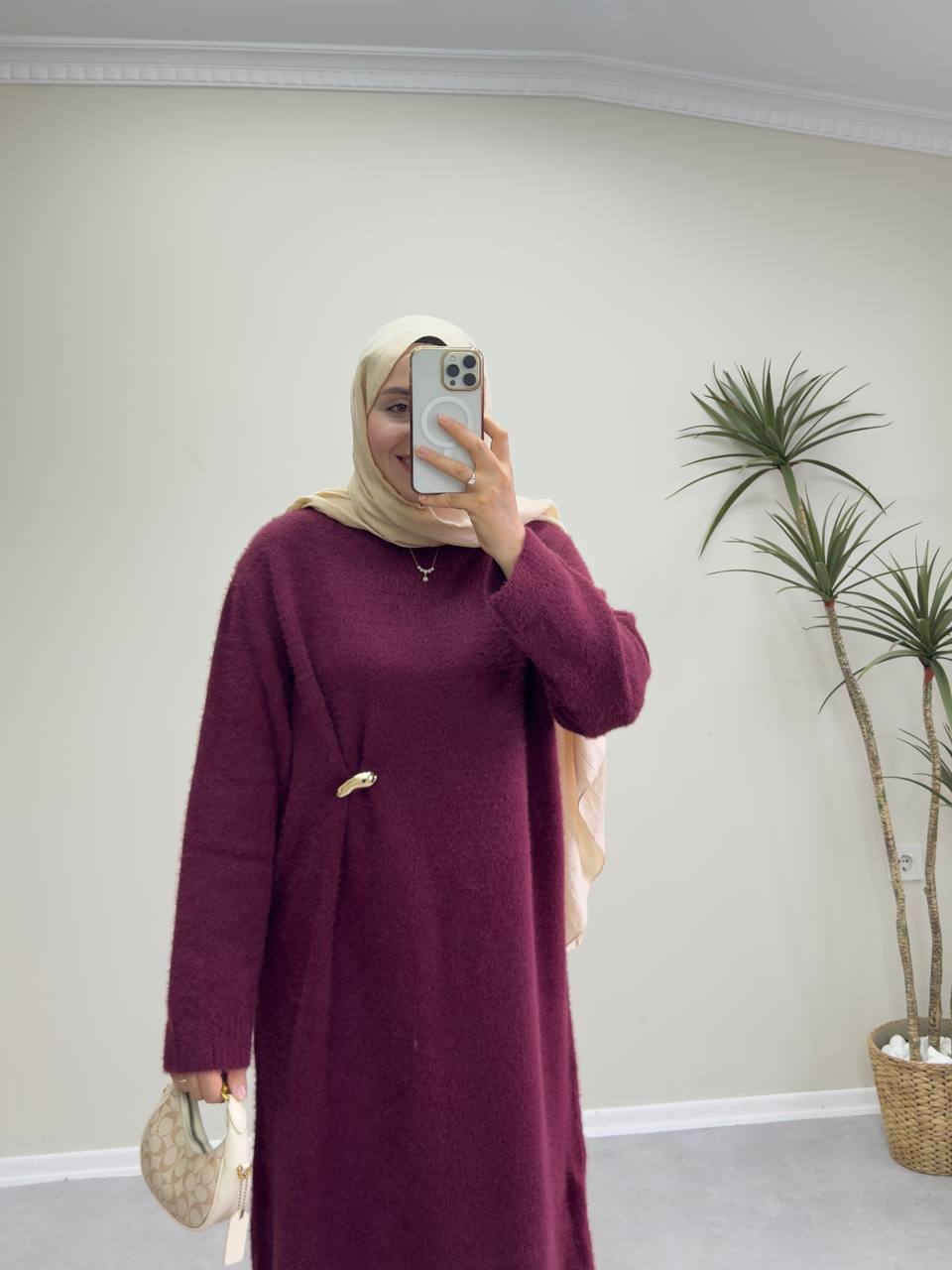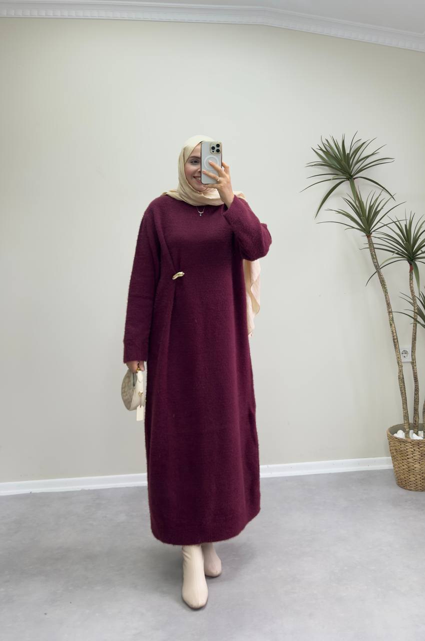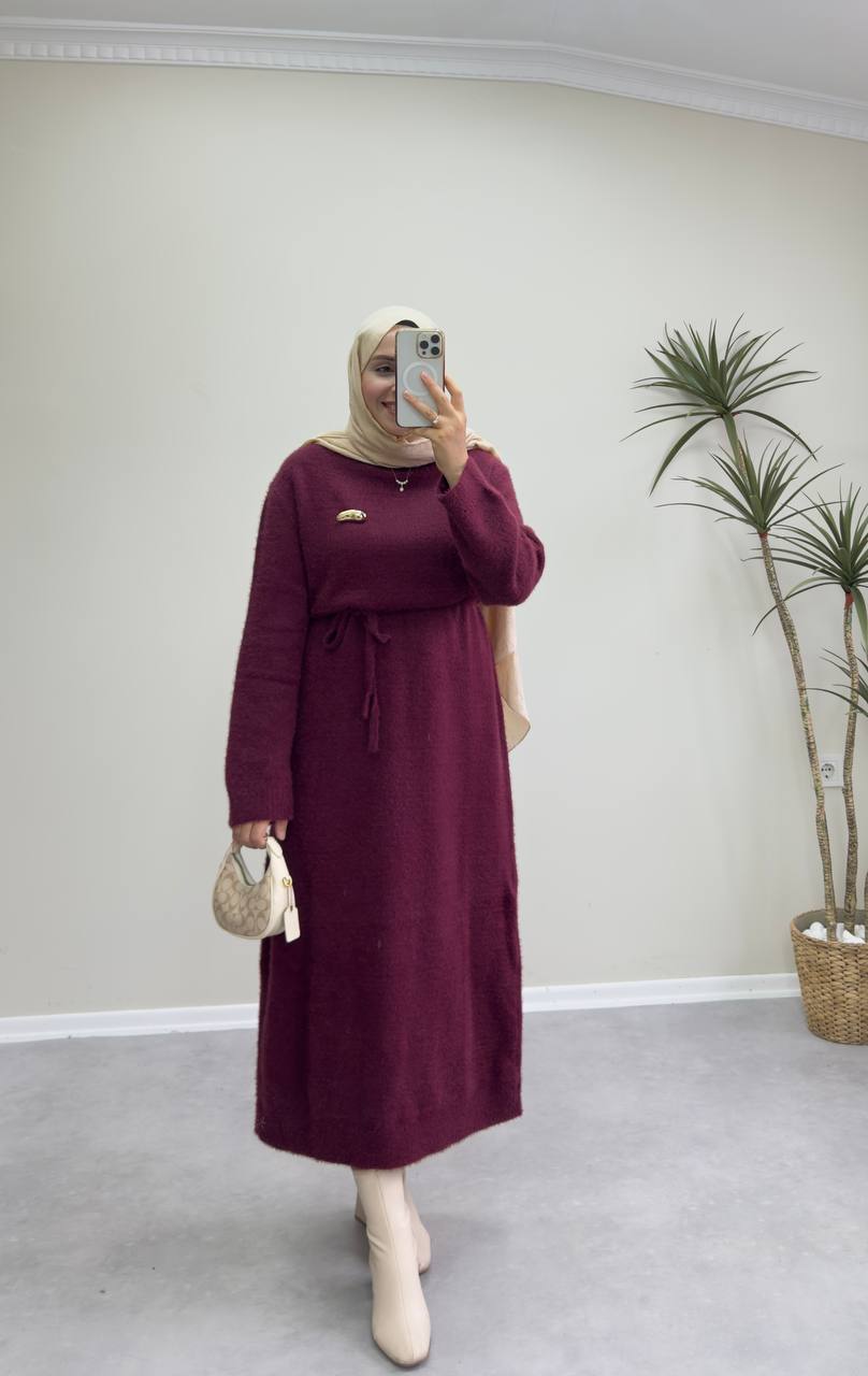 Elbise boy 133 cm sakallı triko kumaştır. Broş hediyelidir. Bir adet seyyar kemeri mevcut. Standart beden 36-44 beden uyumludur.
