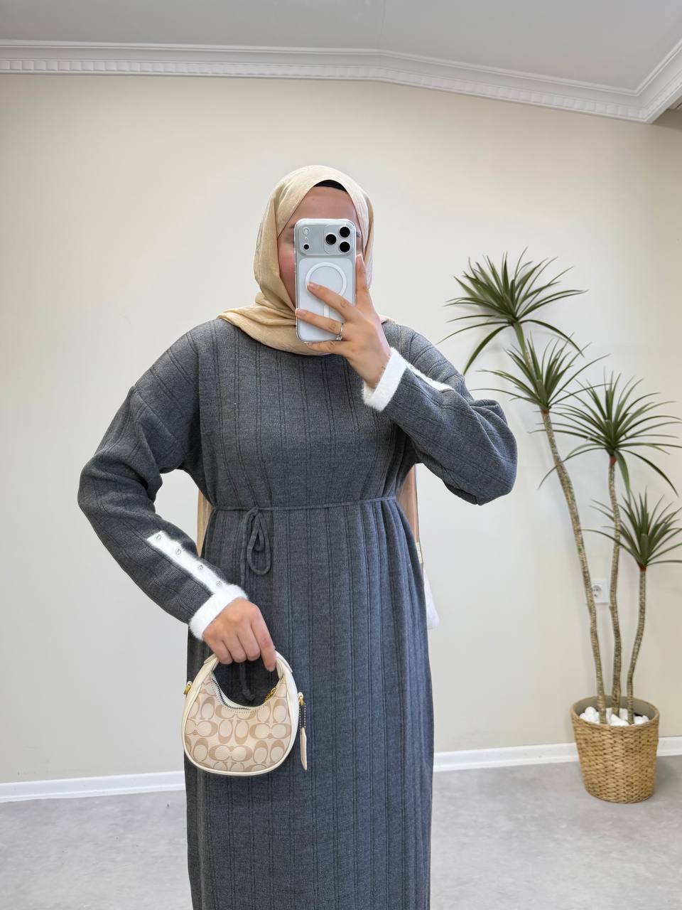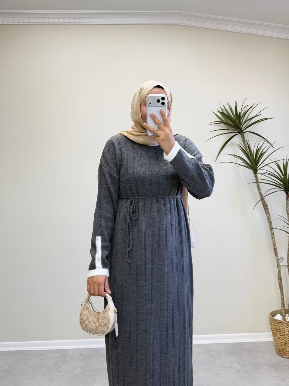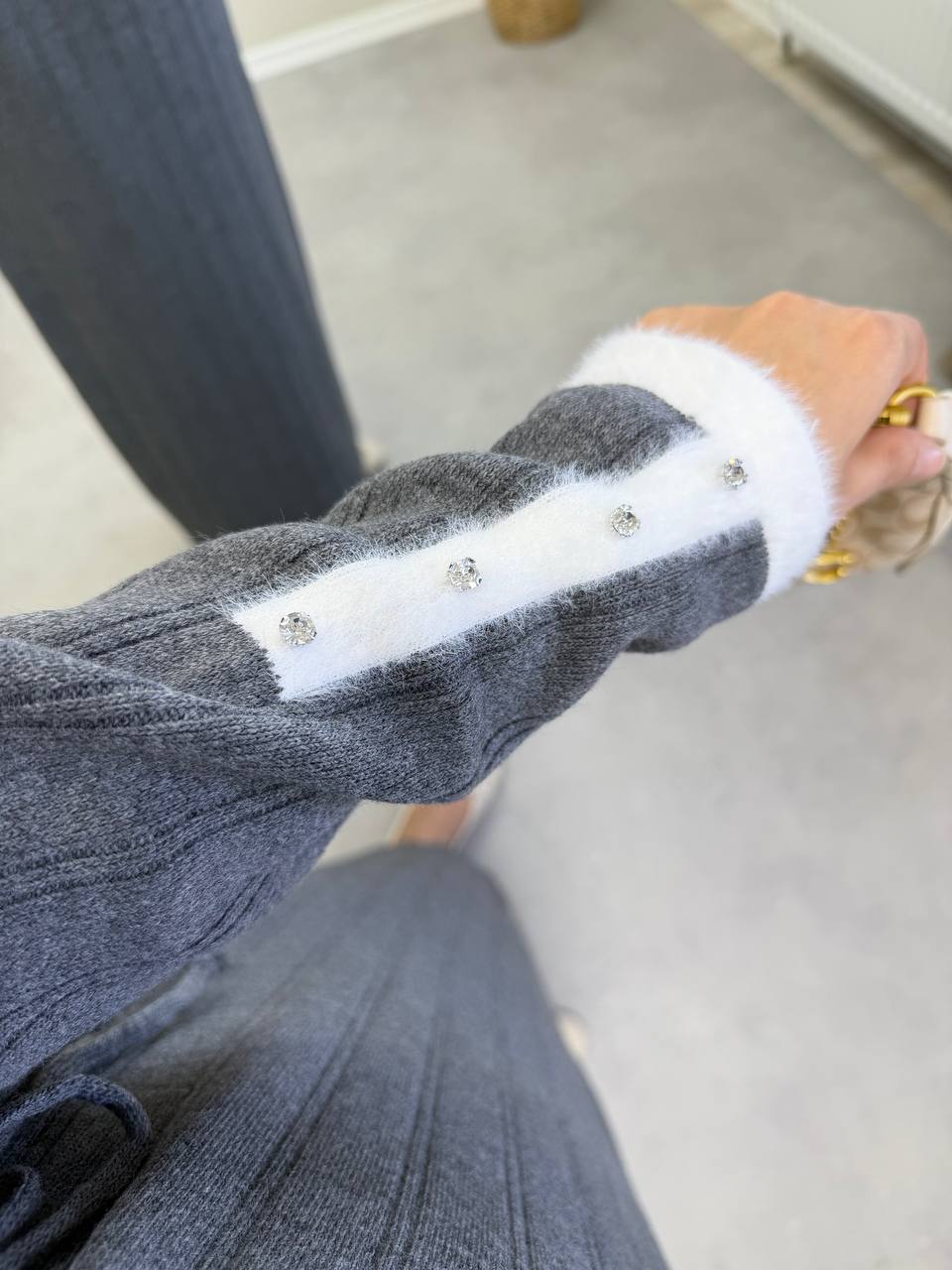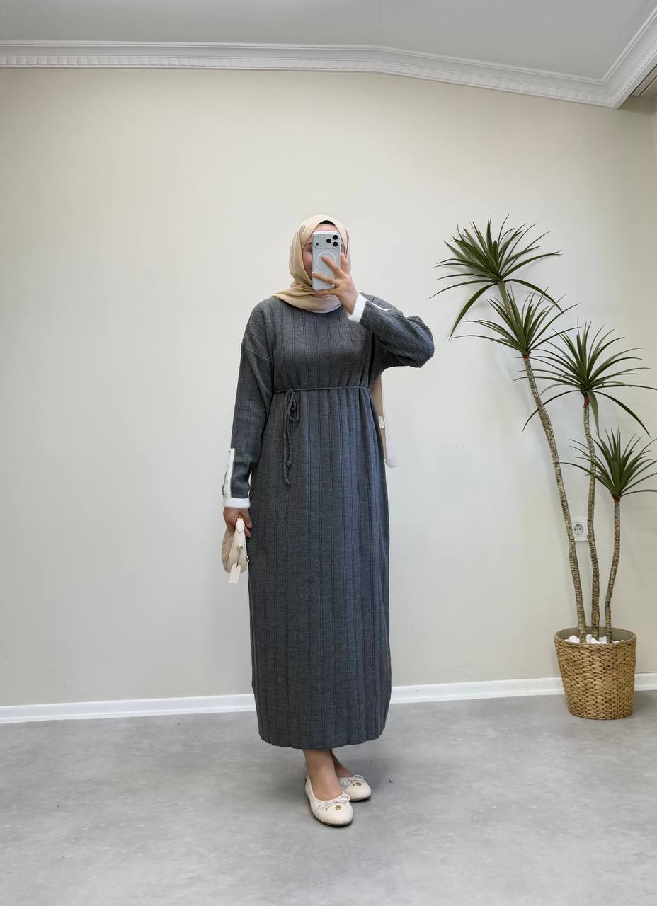 2851 - Kolu Taşlı Triko Elbise - Gri
