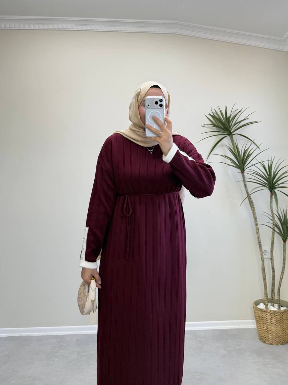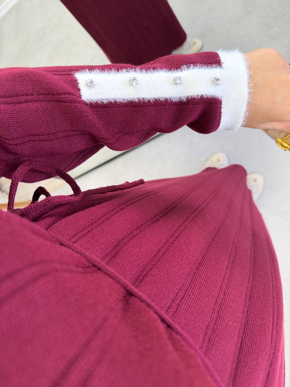 2851 - Kolu Taşlı Triko Elbise - Bordo