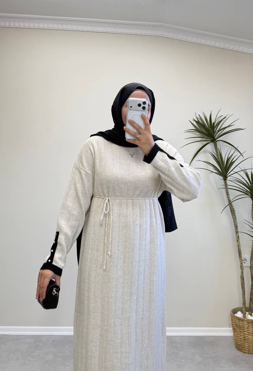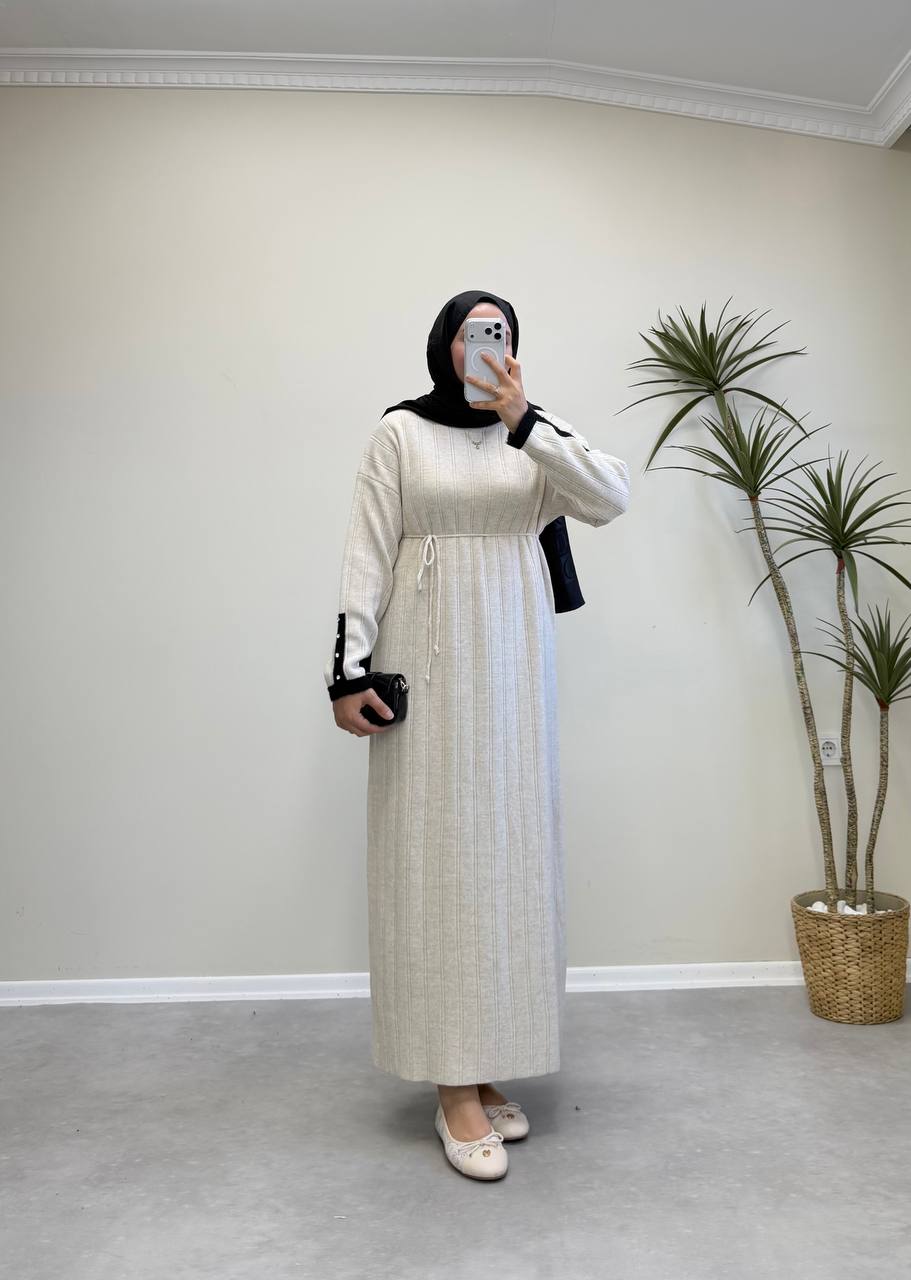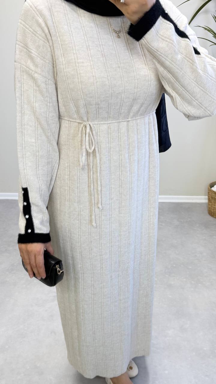 2851 - Kolu Taşlı Triko Elbise - Bej