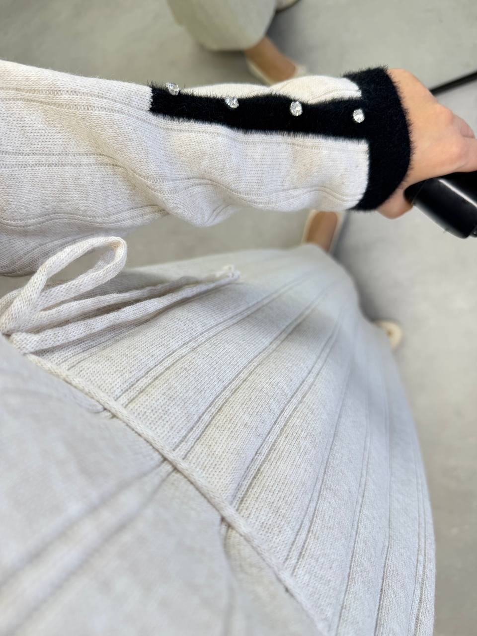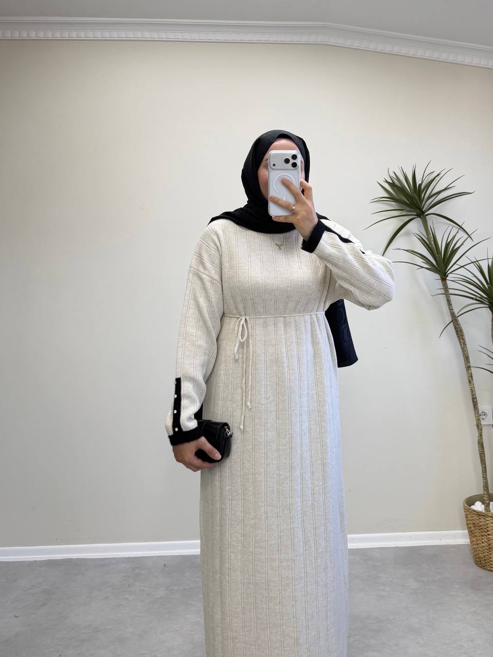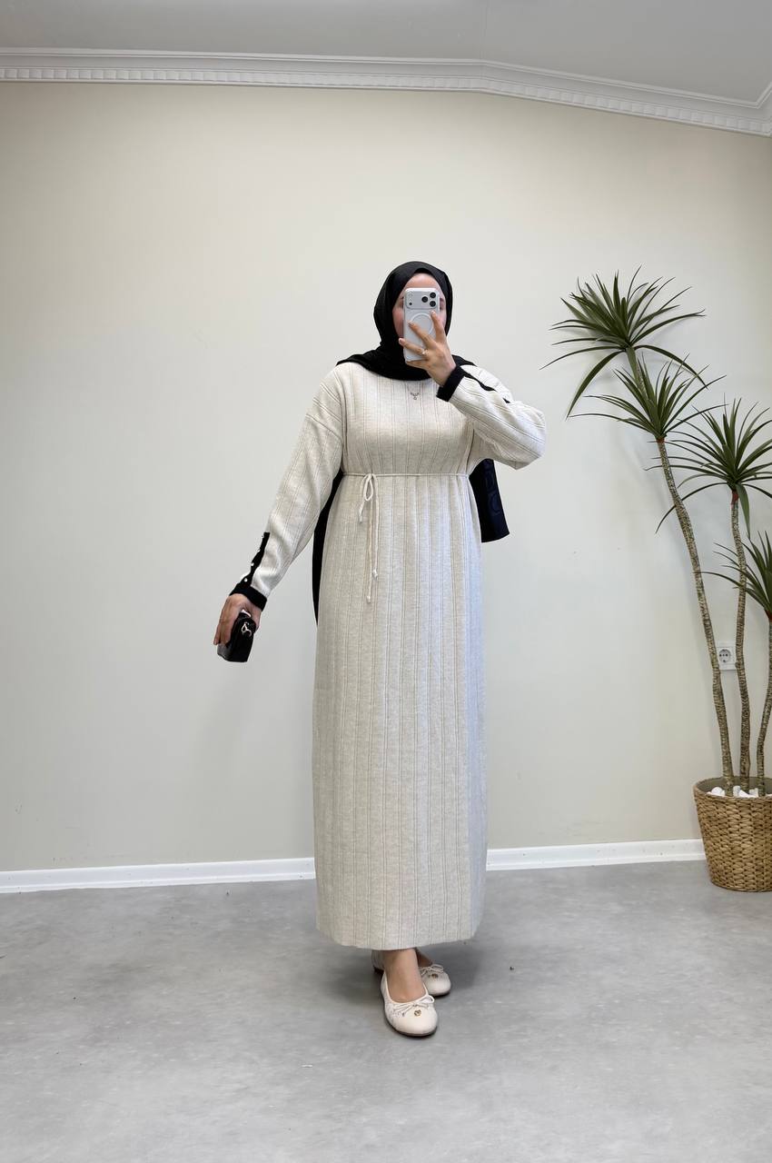 2851 - Kolu Taşlı Triko Elbise - Bej