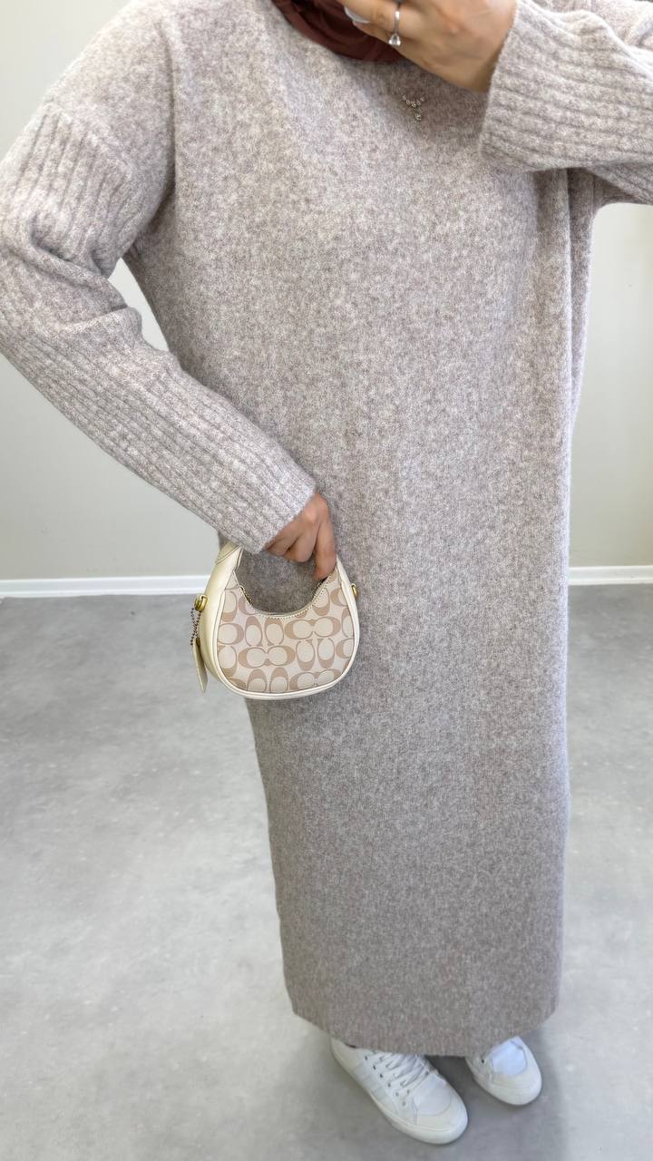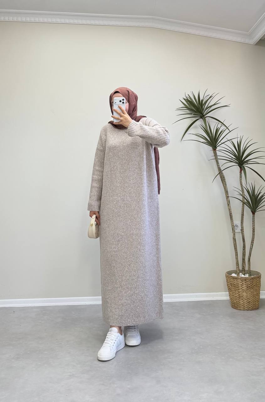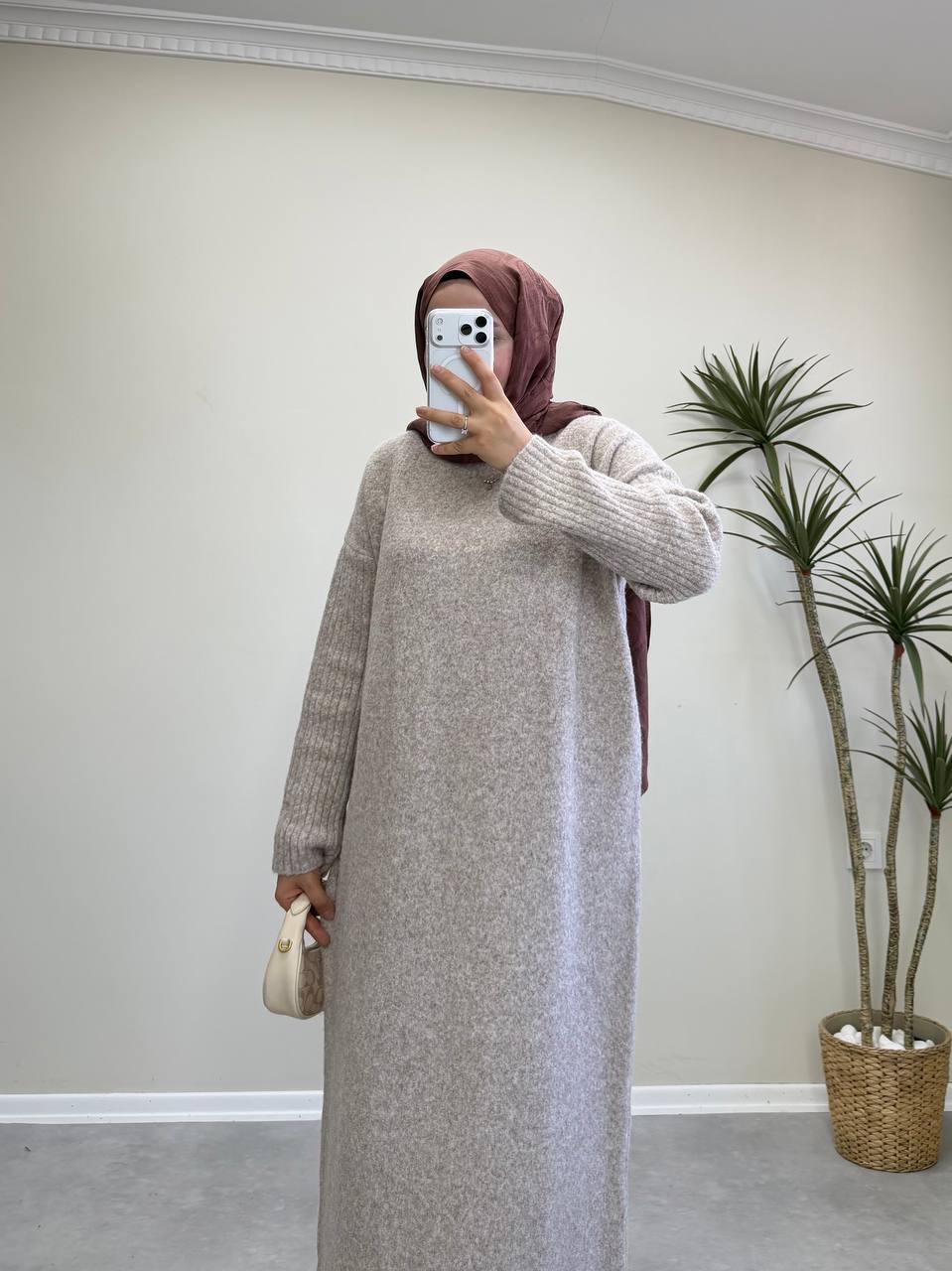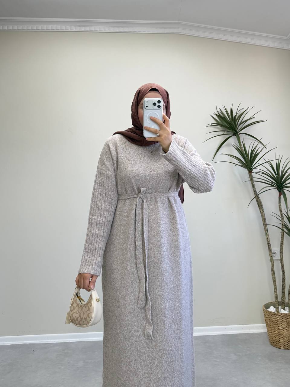Yün triko karışımlı kumaştır. 36-42 beden uyumludur. Elbise boy 130 cm dir.