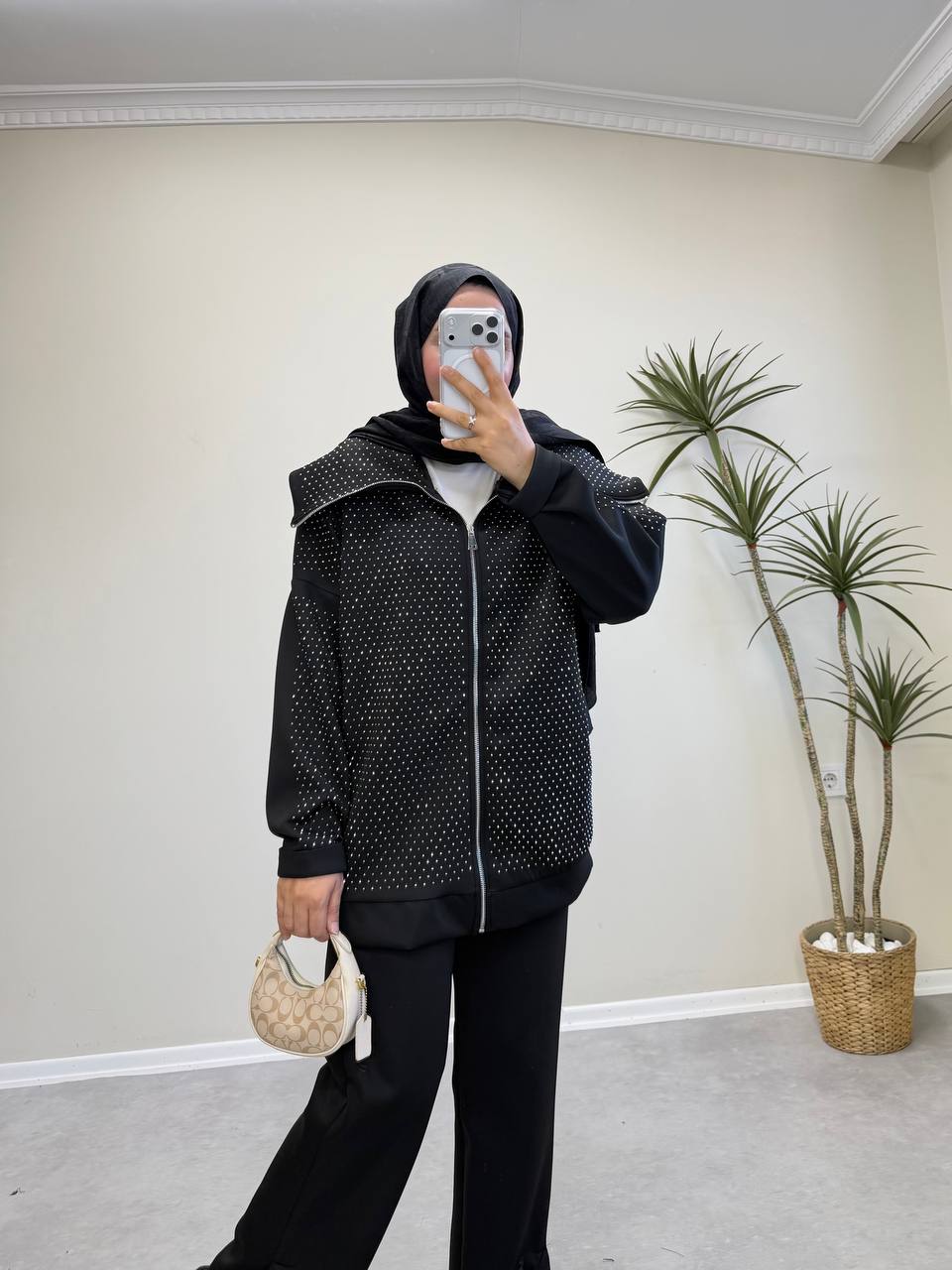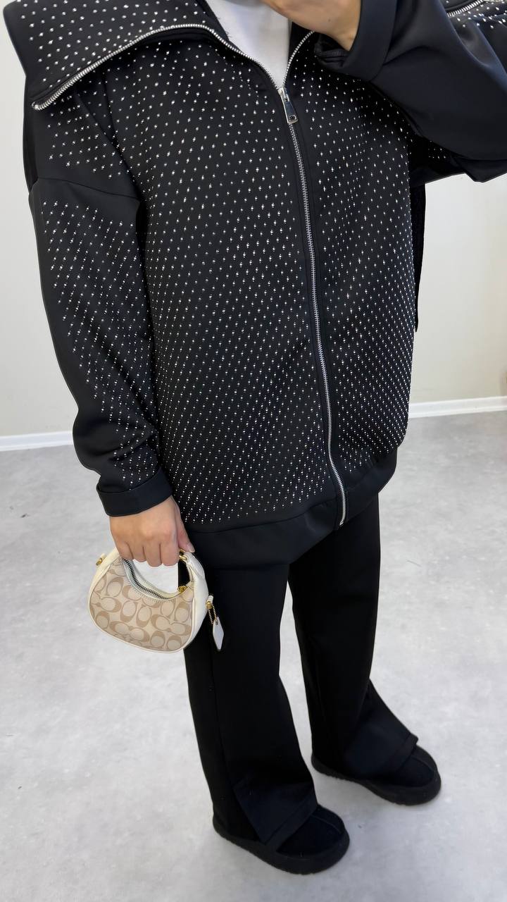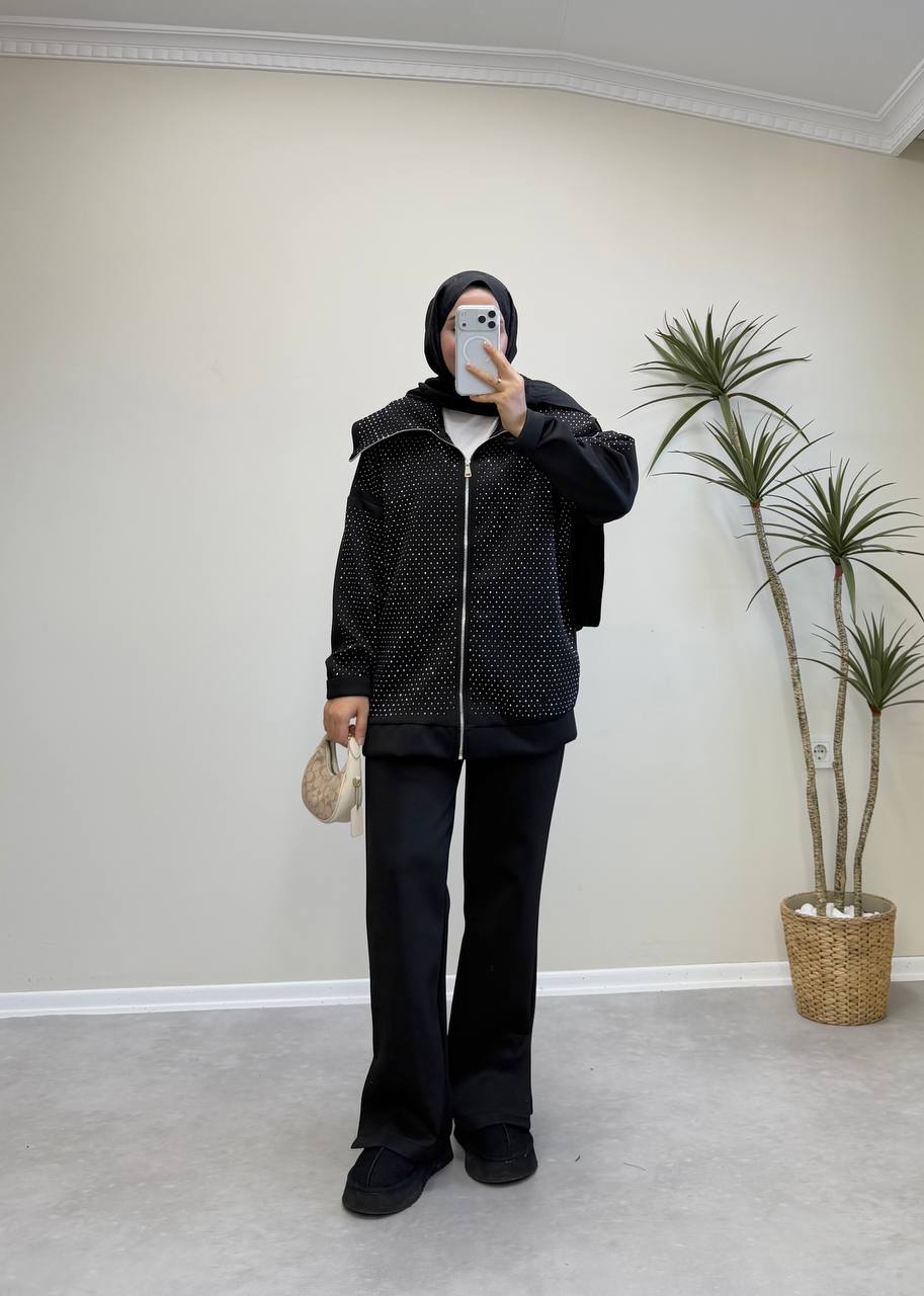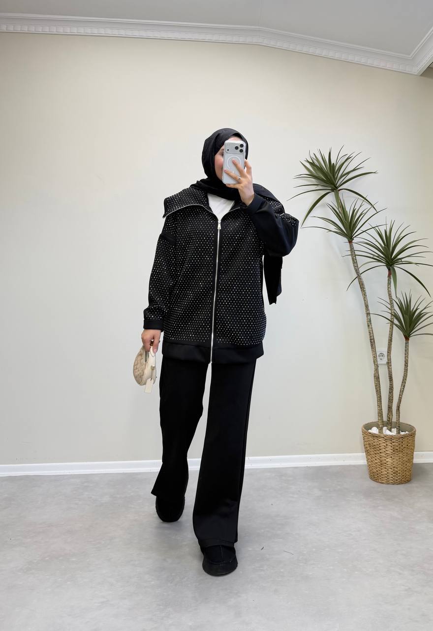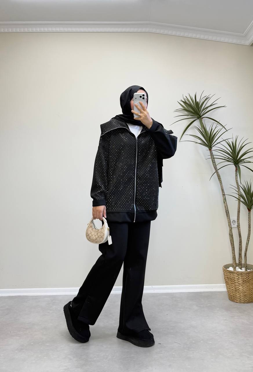 Taşlı Scuba kumaştır. Üst boy 75 cm dir. Pantolon bel lastiklidir, 108 cm dir. Tam kalıptır.