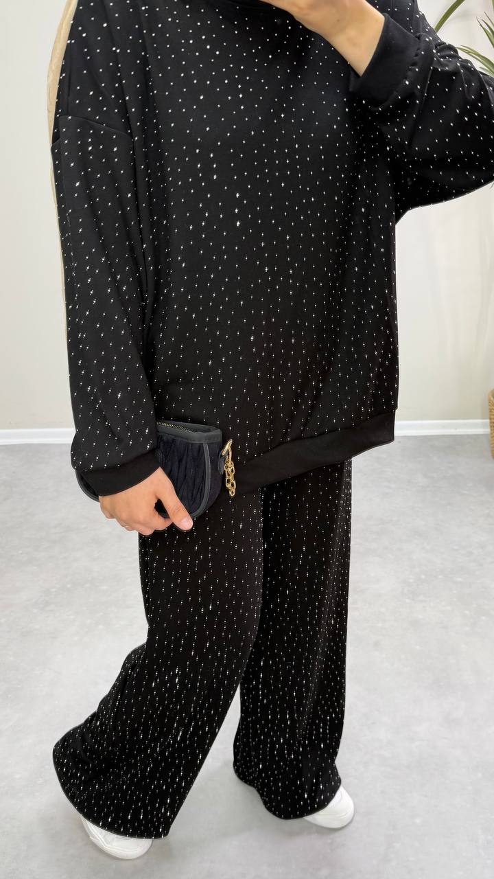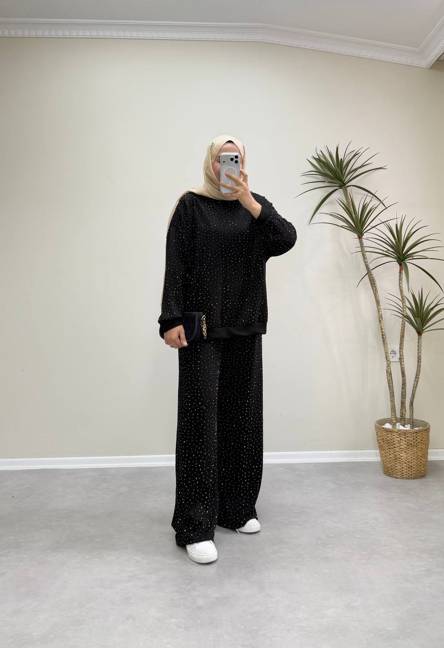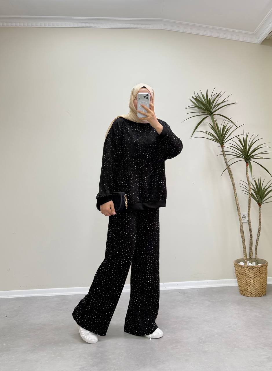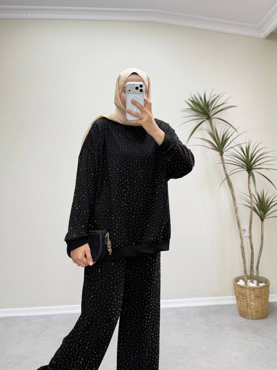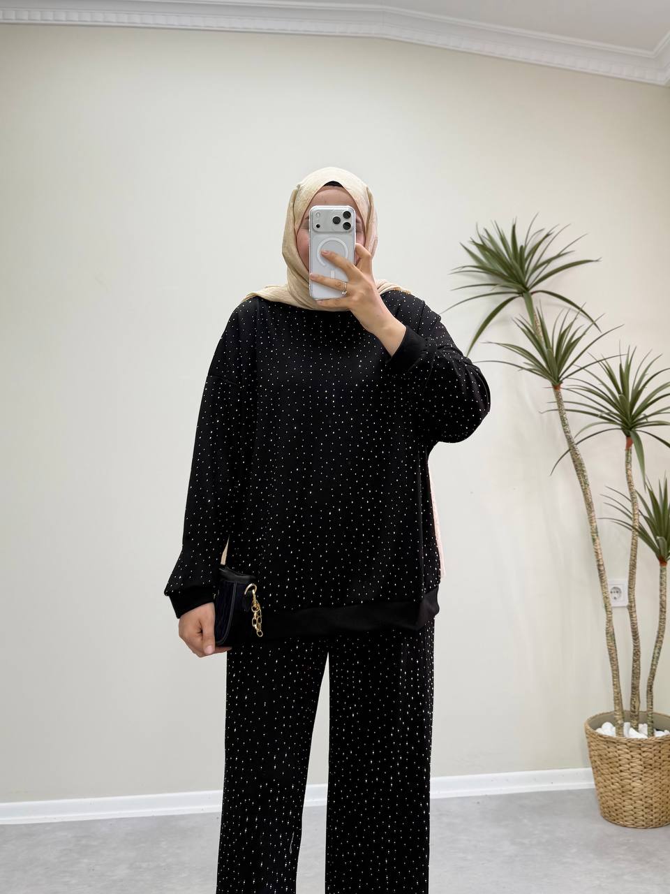 Oysh kumaştan üretilmiştir. Üst boy 70 cm pantolon bel lastikli boy 107 cm dir. Tam kalıptır.